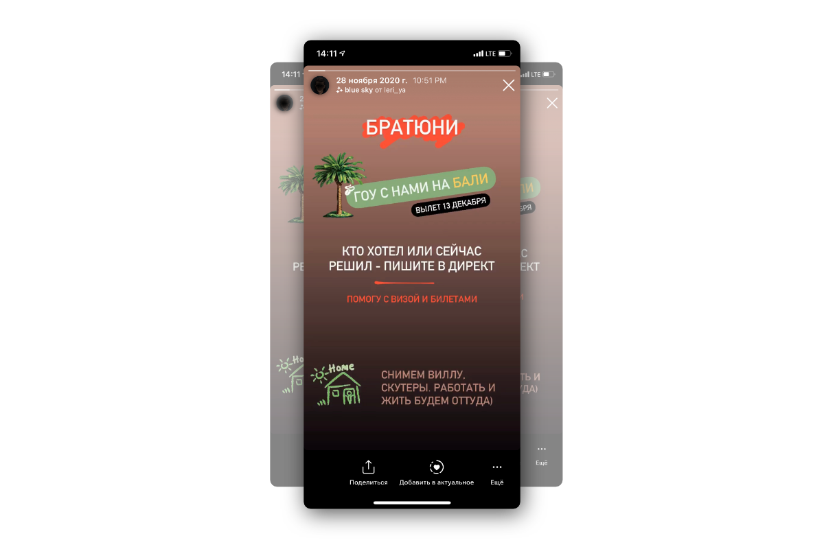 Публиковал в основном сторис о поиске попучика. В них расписывал, как будем беззаботно исследовать остров на мотоциклах, купаться каждое утро в бассейне и постоянно осваивать крутые волны на лучших сёрф-спотах Бали.