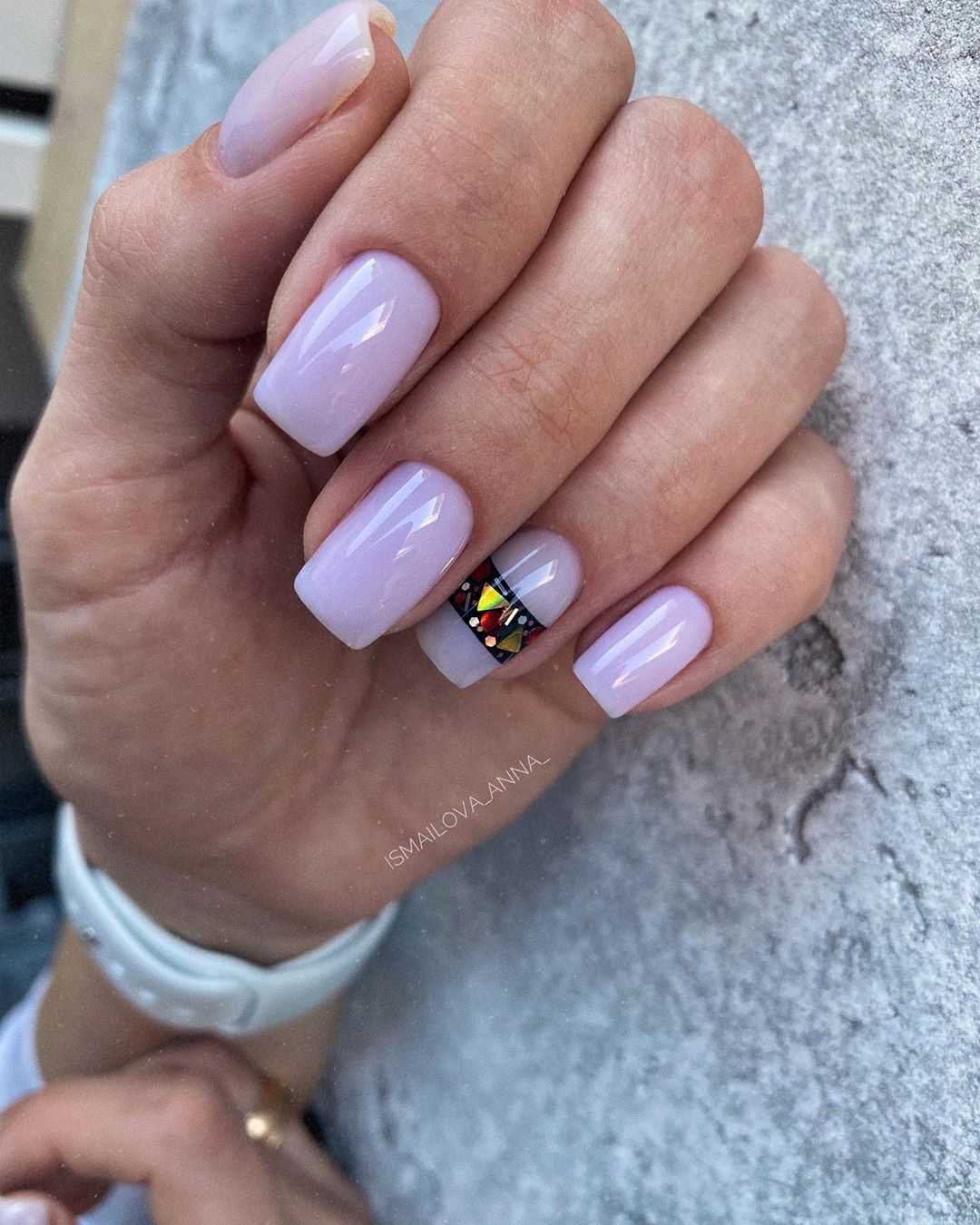 Еще одна новая идея для коротких ногтей квадратной или овальной формы – сочетание negative space c геометрией. Тонкие линии, хаотично размещенные на ногтях, окрашенные в бледно-голубой цвет треугольники и оставленные неокрашенными части поверхности ногтя сделают дизайн невероятно стильным.