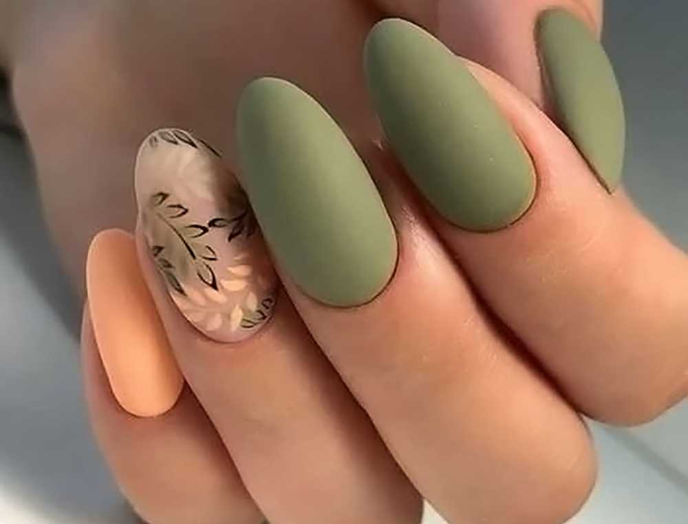 Для лаконичного нейл-арта можно покрыть ногти молочно-розовым оттенком. Указательный и средний пальцы сделать матовыми. На них же разместить парный рисунок нежной веточки, выполненный черным или синим лаком. Получится очень стильно, если ветка будет как-бы скользить по ногтям, спускаясь по бокам с кончика одного ногтя к лунке другого.