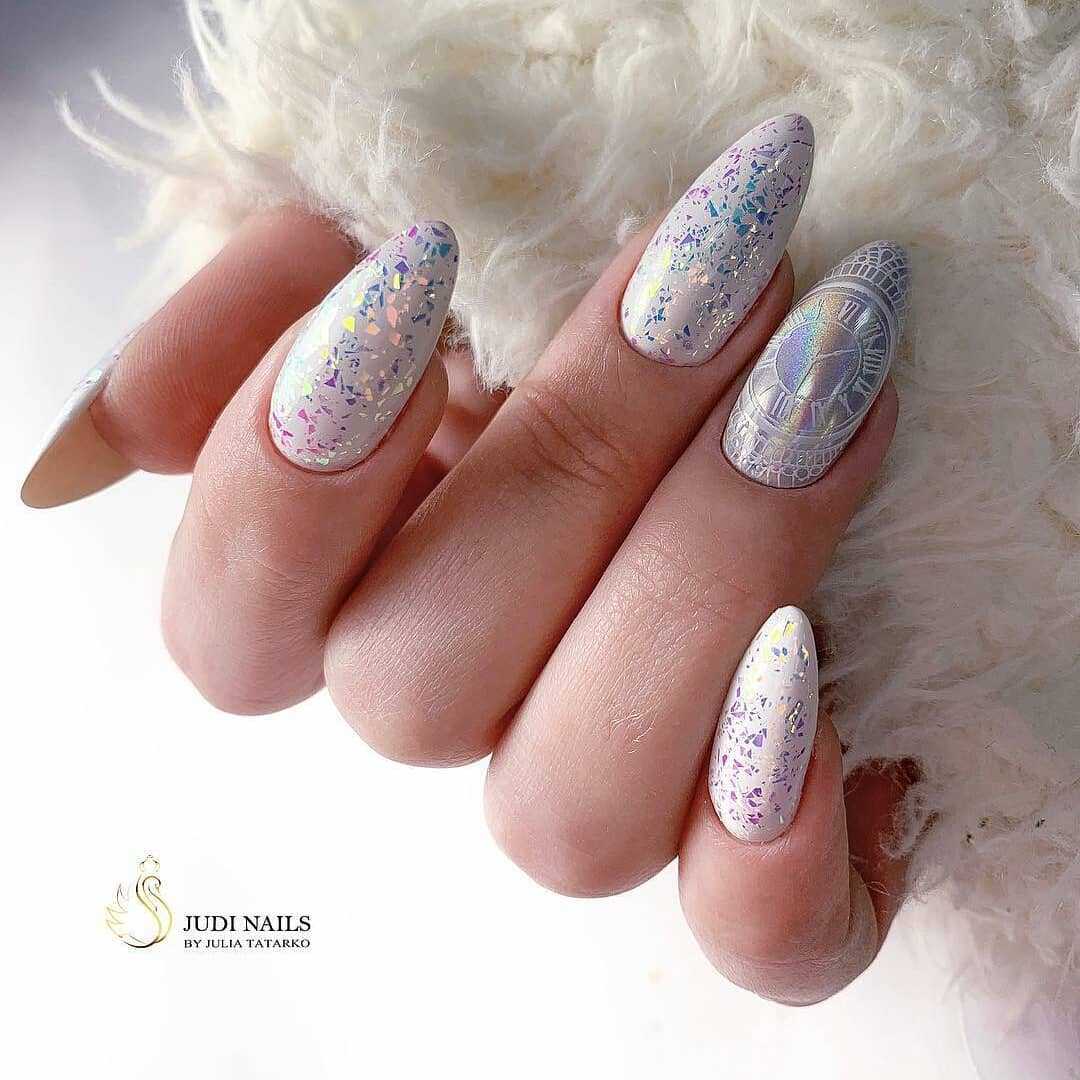 Для повседневных луков можно дополнить молочно-сливочное покрытие эффектом «битого стекла» на безымянном и среднем пальцах. Также можно сделать оттиски фольги или выделить линию «улыбки» тонкой металлизированной полоской.