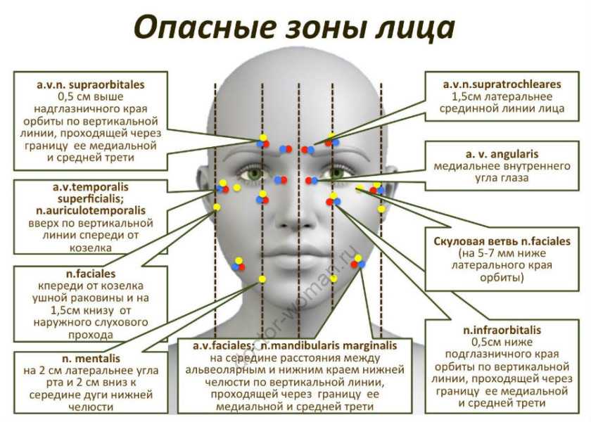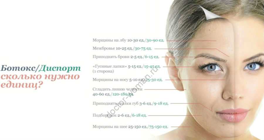 - препарат вводят в зоны скопления морщин в области уголков глаз и бровей, в область нижнего века и верхней губы, наружных углов губ, в область подбородка, шеи и зоны декольте;