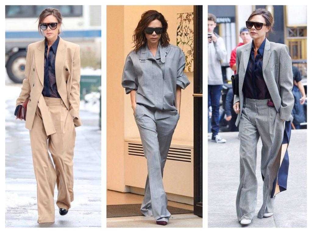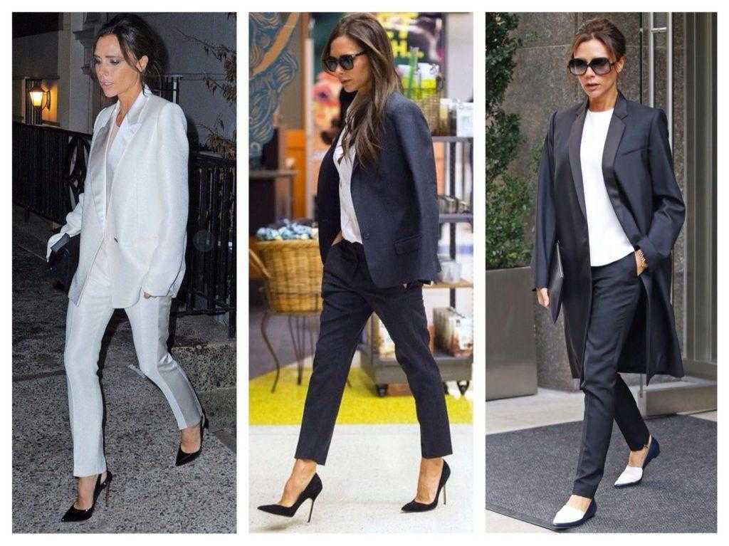 Виктория никогда не носит вещи с крупным рисунком. Верхняя и нижняя часть ее костюмов не бывает контрастной по цвету, чтобы не разделять фигуру на части и не прибавлять ей объем.