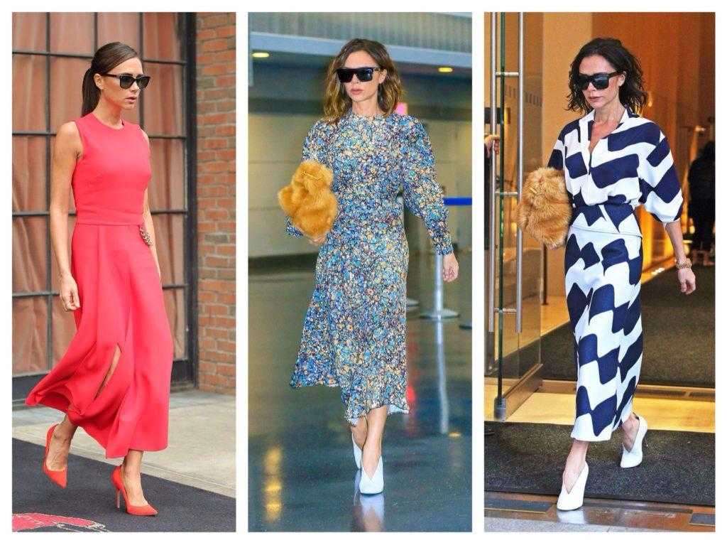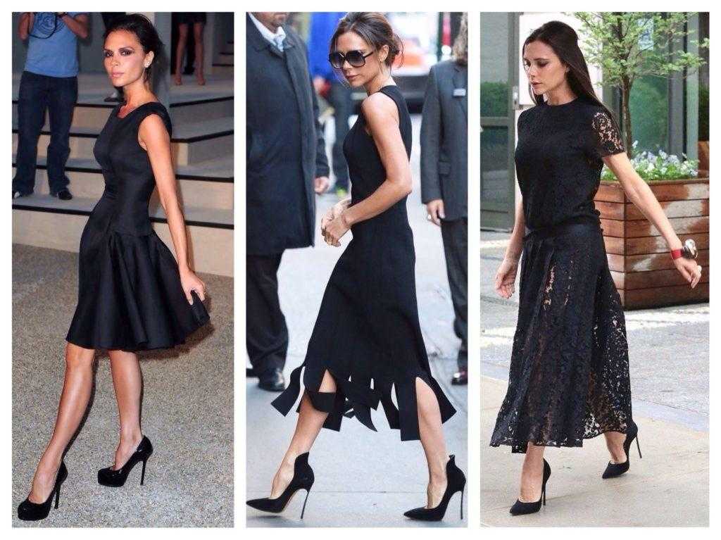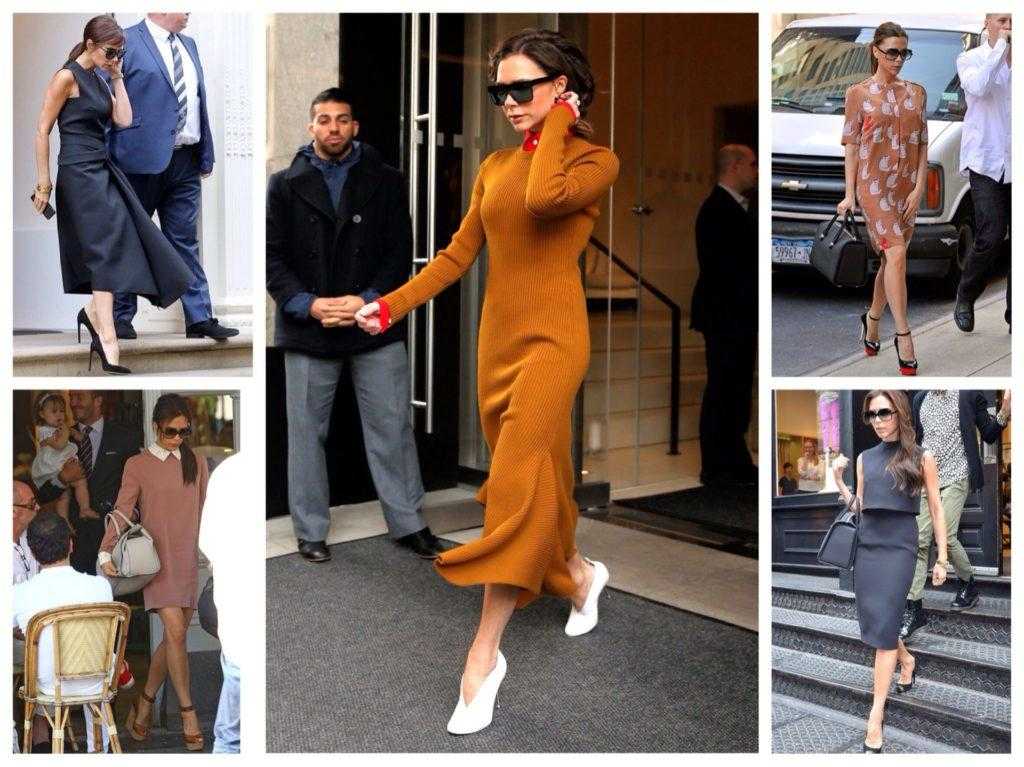 Увидеть на Виктории Бекхэм можно и объемное трикотажное платье, и модель, украшенную баской, и платье в ретро стиле, с пышной юбкой. От длины мини красавица практически отказалась, выбирая фасоны до колена и ниже. Интересная деталь: модница с платьем длиной ниже колена надевает высокие сапоги. На вечерних мероприятиях актуальны модели в пол и со шлейфом. А плечи часто остаются открытыми, так что образы получаются интригующими.