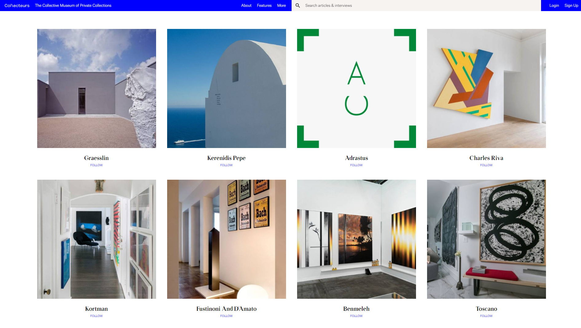 В списке принципов проекта Collecteurs числятся такие: уменьшить углеродный след за счет прекращения перевозки предметов искусства между выставками, недопустимость рекламы и создание независимой арт-журналистики нового качества, поскольку Collecteurs — это еще и онлайн-журнал, где коллекционеры могут выступать авторами материалов. Поистине амбициозный проект. На сайте можно найти разделы мнений, подкастов, интервью и путеводителей по арт-достопримечательностям различных городов. В результате у проекта нет инвесторов и нет рекламы. Доход приносит продажа некоторых экспонатов и трехуровневая подписка, через которую пользователь имеет доступ к специальному софту, возможностям делиться предметами из чужих коллекций, получает VIP-пригласительные на выставки и в мастерские художников.