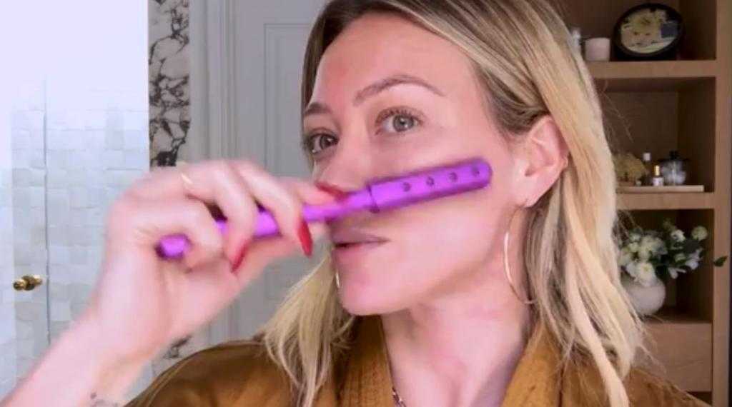 Дафф брызнула дезинфицирующим средством для рук и принялась за работу. В первую очередь светловолосая красавица очищает кожу тоником, который делает цвет кожи ровным. Затем она наносит увлажняющий натуральный крем и водит по лицу валиком для ухода за кожей, чтобы распределить средство. Она утверждает, что массаж с помощью данного инструмента как бы пробуждает вашу кожу.