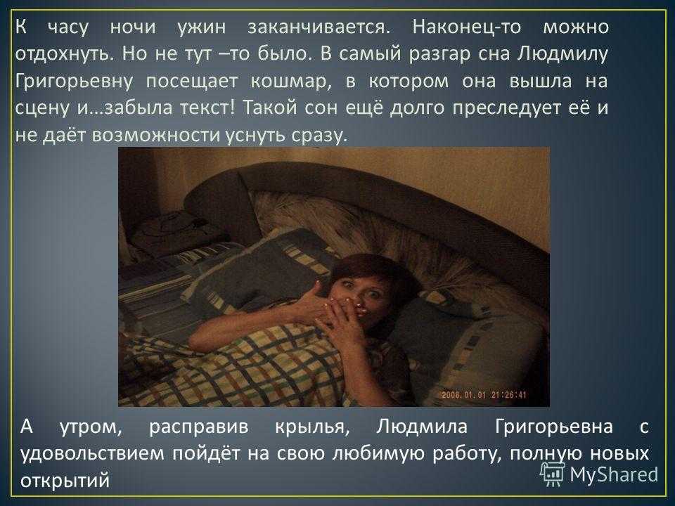 К часу ночи ужин заканчивается. Наконец — то можно отдохнуть. Но не тут – то было. В самый разгар сна Людмилу Григорьевну посещает кошмар, в котором она вышла на сцену и … забыла текст ! Такой сон ещё долго преследует её и не даёт возможности уснуть сразу. А утром, расправив крылья, Людмила Григорьевна с удовольствием пойдёт на свою любимую работу, полную новых открытий