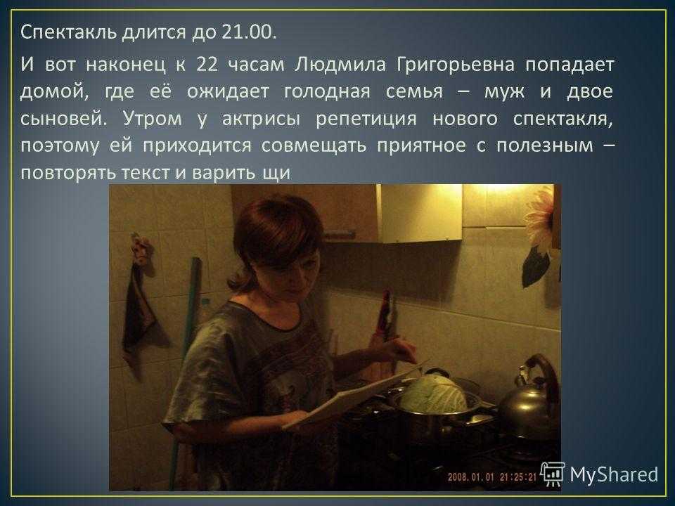 Спектакль длится до И вот наконец к 22 часам Людмила Григорьевна попадает домой, где её ожидает голодная семья – муж и двое сыновей. Утром у актрисы репетиция нового спектакля, поэтому ей приходится совмещать приятное с полезным – повторять текст и варить щи