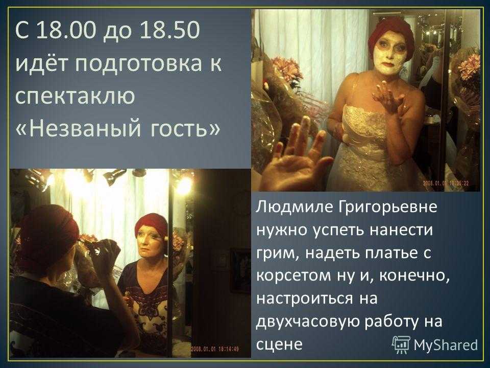 C до идёт подготовка к спектаклю « Незваный гость » Людмиле Григорьевне нужно успеть нанести грим, надеть платье с корсетом ну и, конечно, настроиться на двухчасовую работу на сцене