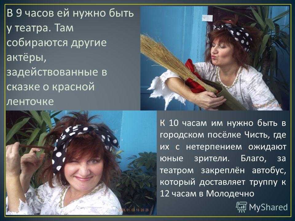 В 9 часов ей нужно быть у театра. Там собираются другие актёры, задействованные в сказке о красной ленточке К 10 часам им нужно быть в городском посёлке Чисть, где их с нетерпением ожидают юные зрители. Благо, за театром закреплён автобус, который доставляет труппу к 12 часам в Молодечно