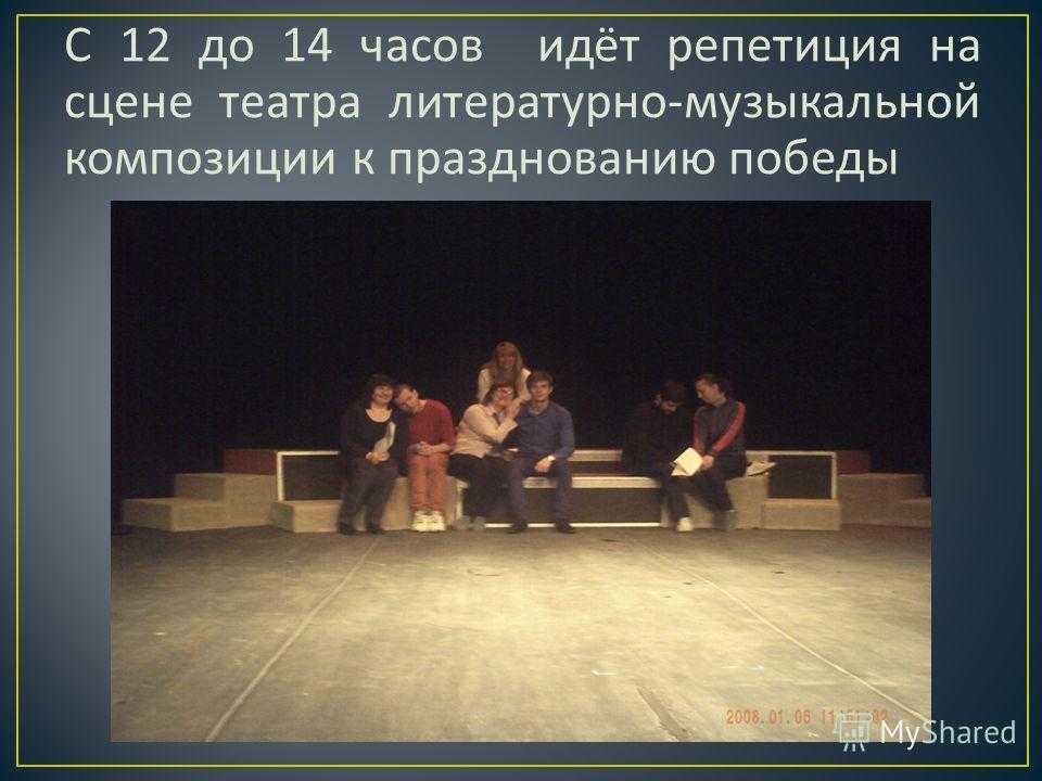 С 12 до 14 часов идёт репетиция на сцене театра литературно — музыкальной композиции к празднованию победы