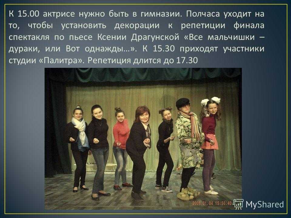 К актрисе нужно быть в гимназии. Полчаса уходит на то, чтобы установить декорации к репетиции финала спектакля по пьесе Ксении Драгунской « Все мальчишки – дураки, или Вот однажды …». К приходят участники студии « Палитра ». Репетиция длится до 17.30