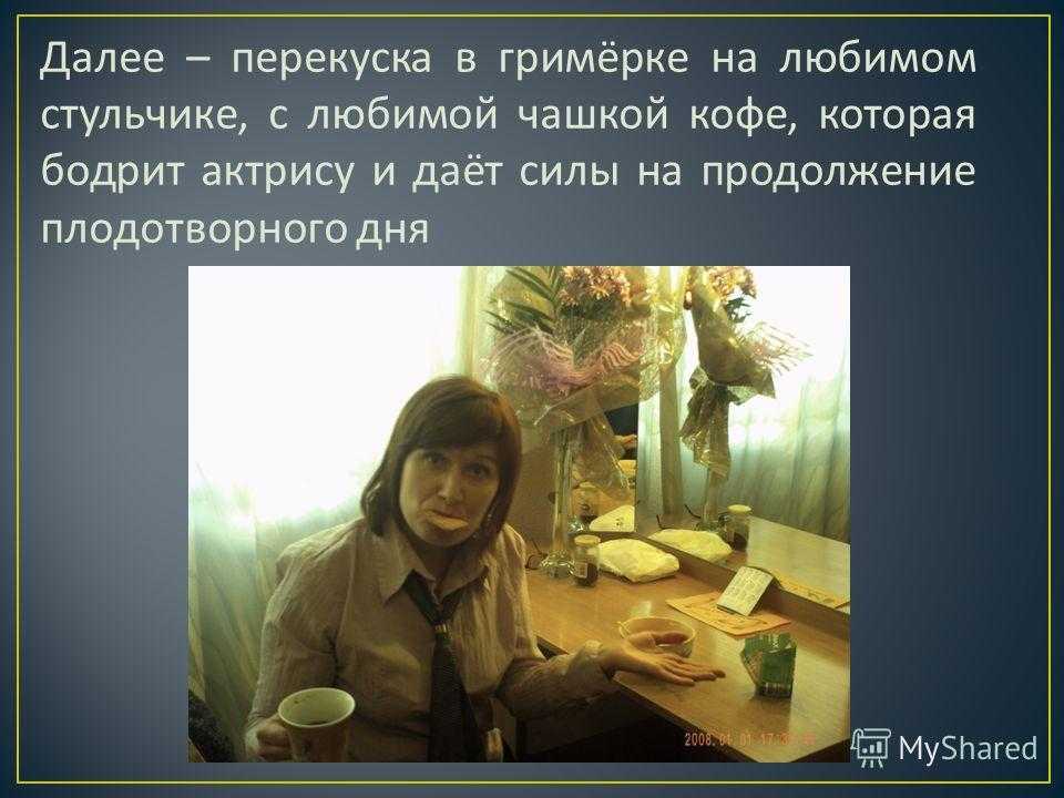 Далее – перекуска в гримёрке на любимом стульчике, с любимой чашкой кофе, которая бодрит актрису и даёт силы на продолжение плодотворного дня