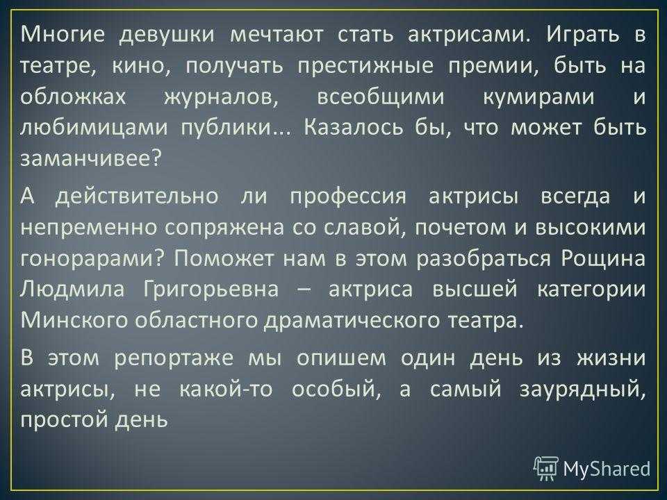 Многие девушки мечтают стать актрисами. Играть в театре, кино, получать престижные премии, быть на обложках журналов, всеобщими кумирами и любимицами публики… Казалось бы, что может быть заманчивее ? А действительно ли профессия актрисы всегда и непременно сопряжена со славой, почетом и высокими гонорарами ? Поможет нам в этом разобраться Рощина Людмила Григорьевна – актриса высшей категории Минского областного драматического театра. В этом репортаже мы опишем один день из жизни актрисы, не какой — то особый, а самый заурядный, простой день