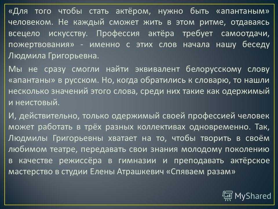 « Для того чтобы стать актёром, нужно быть « апантаным » человеком. Не каждый сможет жить в этом ритме, отдаваясь всецело искусству. Профессия актёра требует самоотдачи, пожертвования » — именно с этих слов начала нашу беседу Людмила Григорьевна. Мы не сразу смогли найти эквивалент белорусскому слову « апантаны » в русском. Но, когда обратились к словарю, то нашли несколько значений этого слова, среди них такие как одержимый и неистовый. И, действительно, только одержимый своей профессией человек может работать в трёх разных коллективах одновременно. Так, Людмилы Григорьевны хватает на то, чтобы творить в своём любимом театре, передавать свои знания молодому поколению в качестве режиссёра в гимназии и преподавать актёрское мастерство в студии Елены Атрашкевич « Спяваем разам »