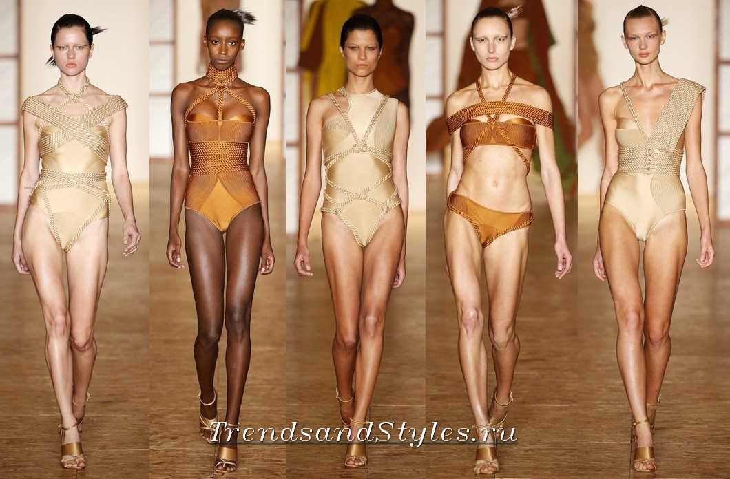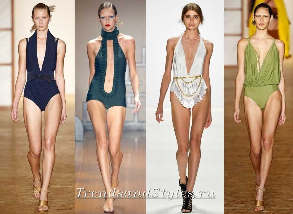 Слитные модели представлены новинками с очень глубокими декольте и высокими вырезами на бедрах в сочетании с элементами декора, прозрачными вставками, плетением или шнуровкой.
