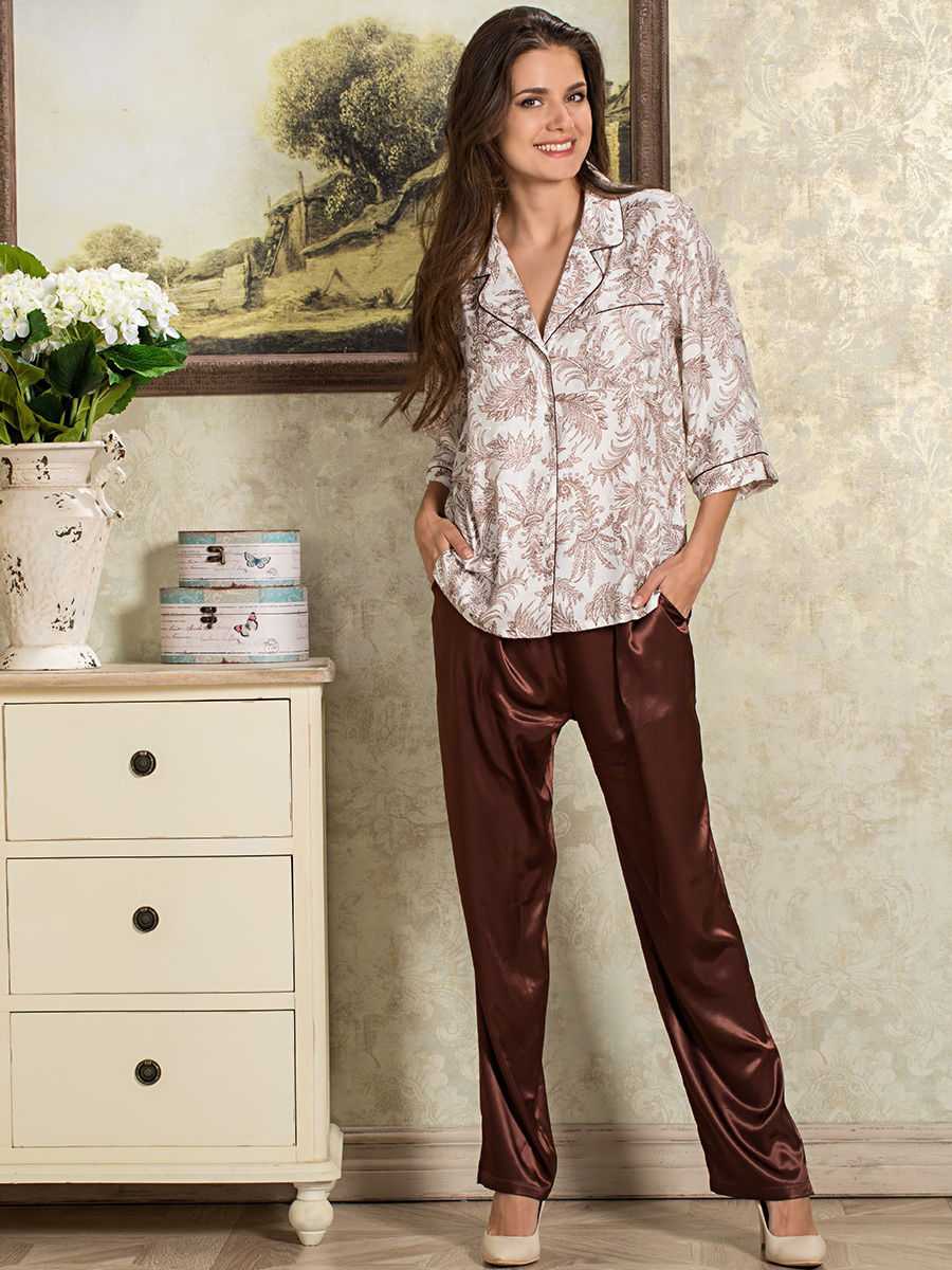 Брючные комплекты или спортивные костюмы удобный вариант для уборки или прогулки, в них тепло и комфортно. Вместо брюк используют джинсы, для максимального комфорта они должны быть очень тянущимися, обязательно не прилегающими. Такими же удобными для многих являются леггинсы с туниками, они выглядят привлекательно. Преимущество комплектов со штанами — их практичность и простота ухода. Такая одежда легко стирается и отлично носится. Атласные костюмы менее практичны, но они более нарядные и элегантные, в такой одежде можно дома ходить, принимать гостей, и даже надеть на выписку из роддома.