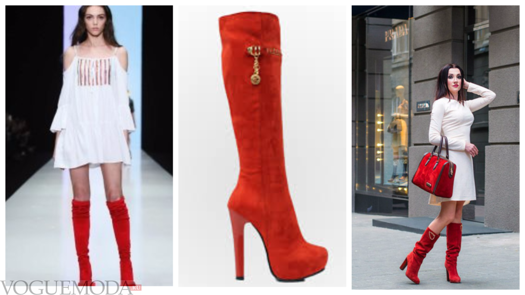 | На свидание | Под ярко-алые сапоги на шпильке зрелые женщины могут надеть бежевое или светло-коричневое платье. Девушки могут смело сочетать их с элегантными нарядами белого цвета |