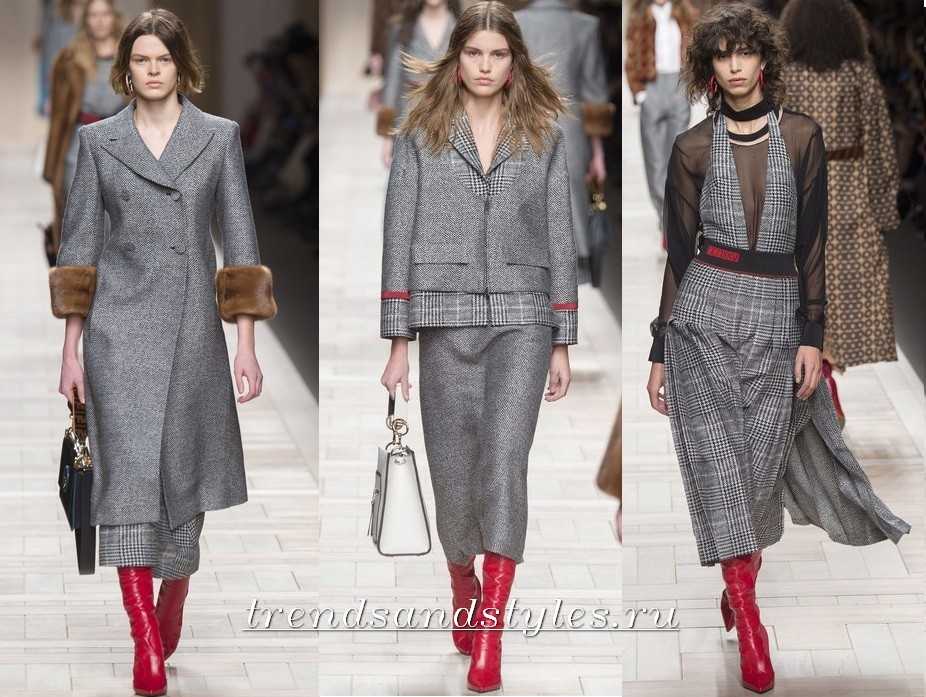 Довольно необычным окрасом, покорившим мировые подиумы является клетка. Многие костюмы будто бы сшиты из уютного клетчатого одеяла, от них веет теплом, так что этот принт также поселится в гардеробах модниц. Такие костюмы прекрасно смотрятся с красными сапогами.