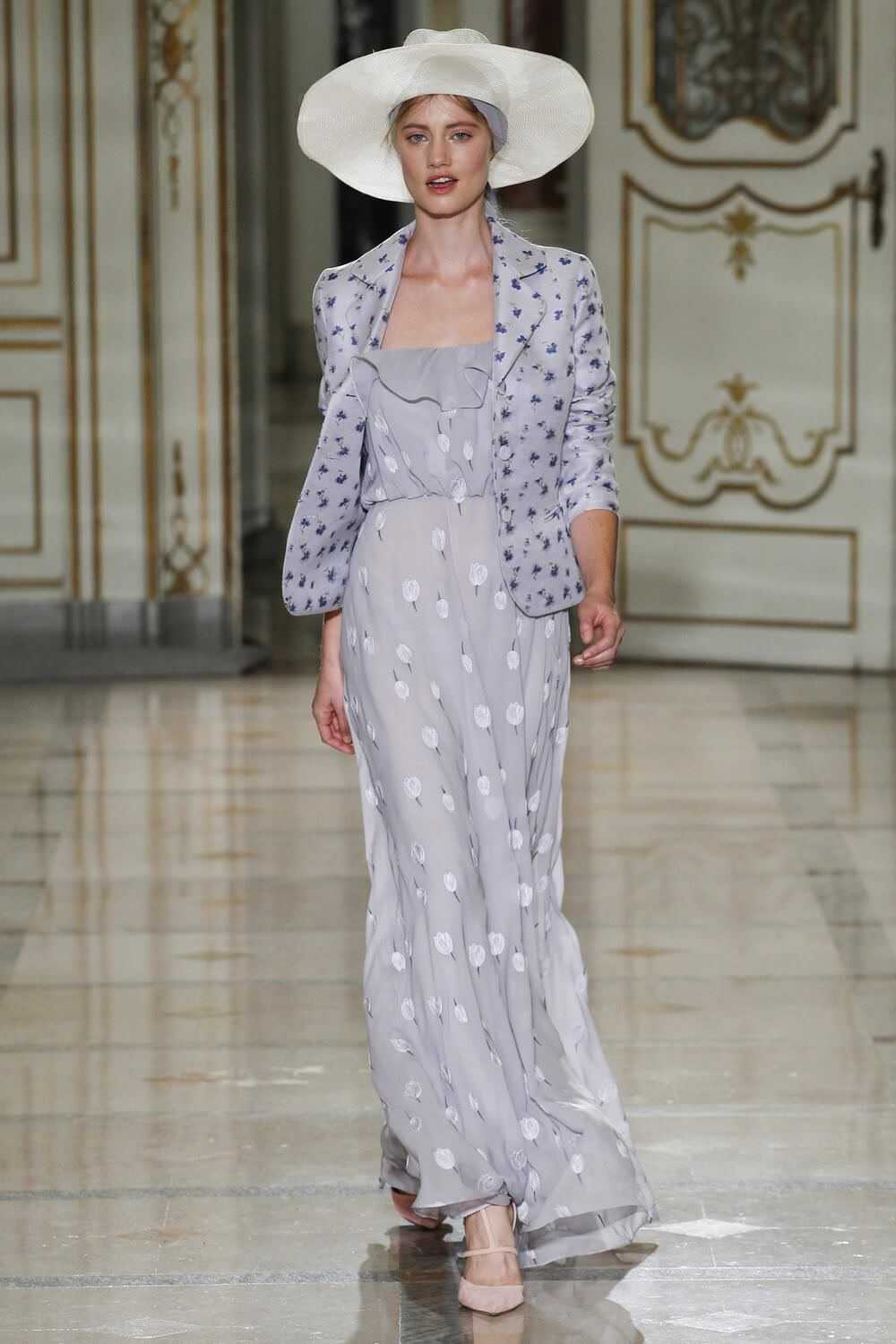 Модный дом Carolina Herrera предложил воздушное многослойное платье с воланами в сочетании с контрастными брюками