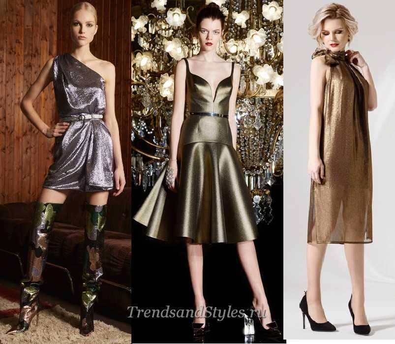 Блестящие короткие платья на Новый год 2021 (фото ниже) из материалов с металлизированными нитями составят конкуренцию фасонам с пейетками. Только женщинам дано выбирать, какие уборы будут украшать их в праздничную ночь.