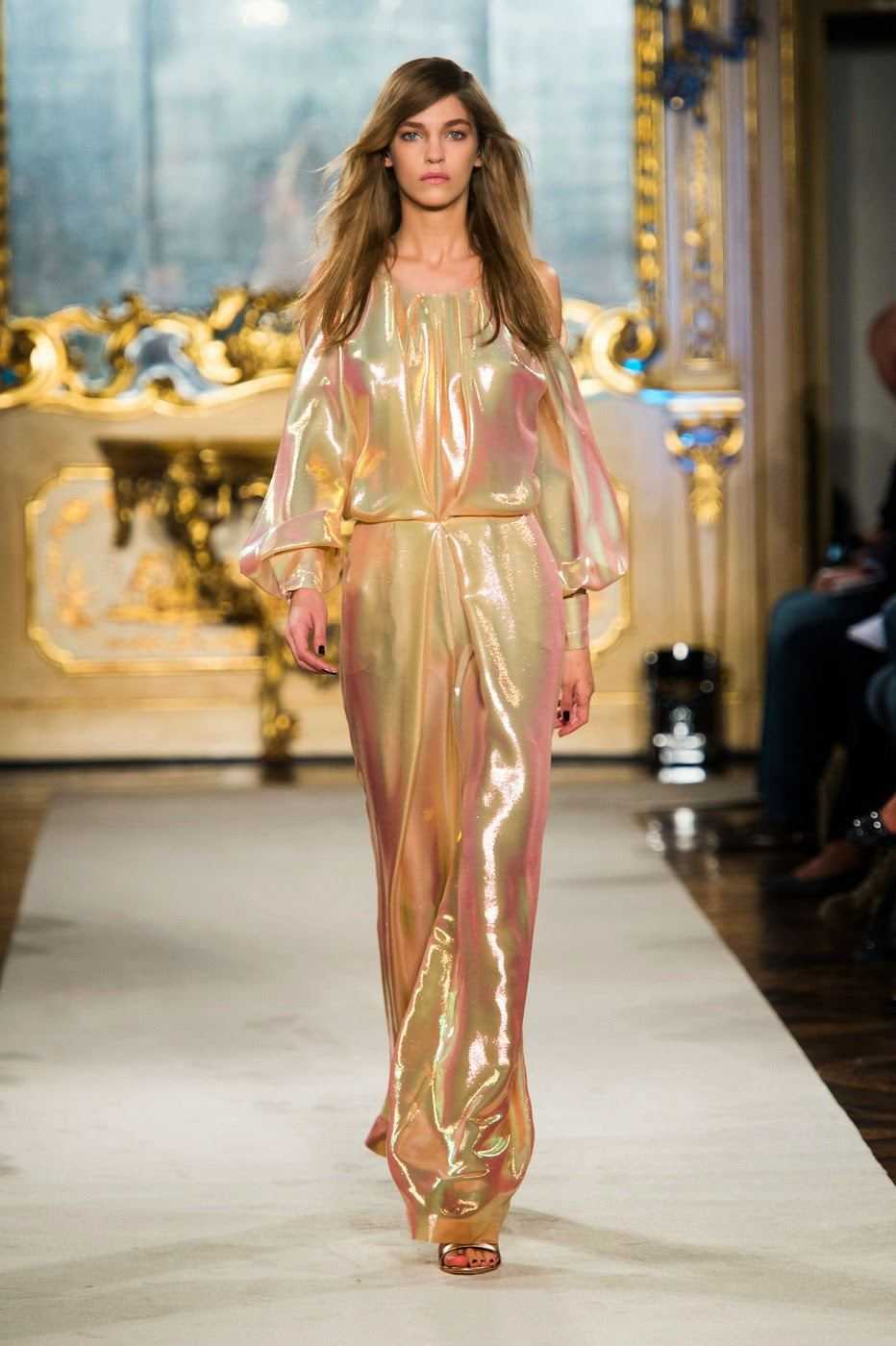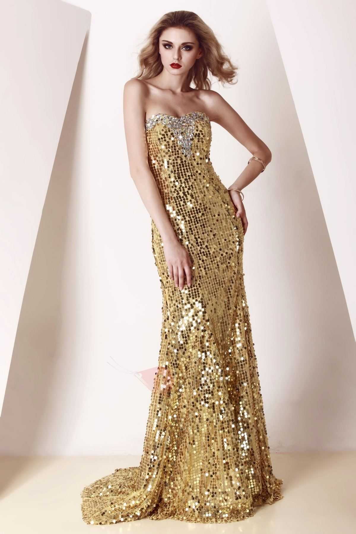Длинное золотистое платье с пайетками.