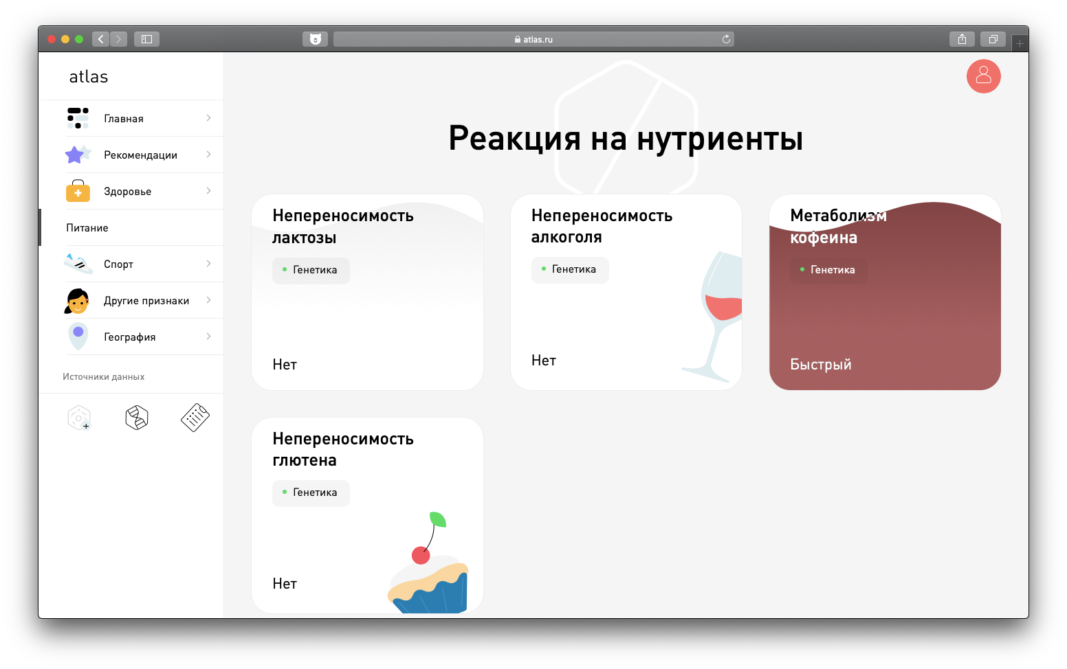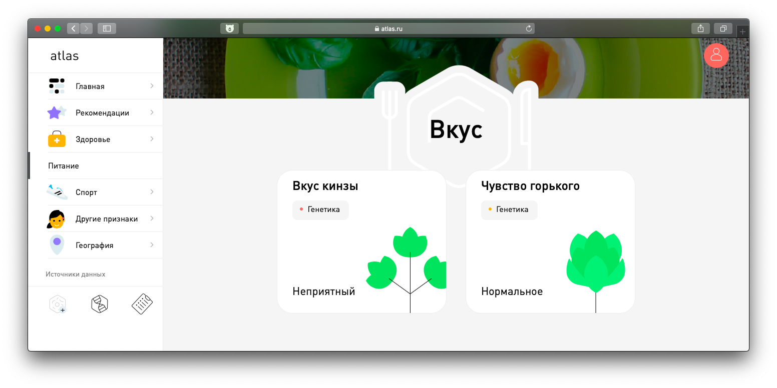 Результаты Генетического теста включают особенности восприятия вкуса, реакцию на нутриенты, уровень витаминов и минералов, омега-3 и 6 жирных кислот. Все это отражено в разделе Питание в личном кабинете.