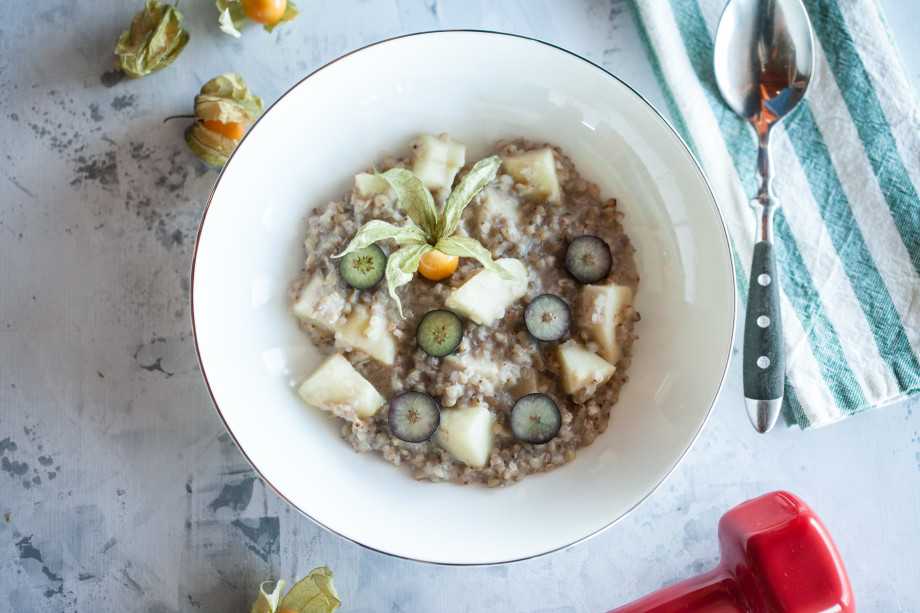 Каша из зеленой гречки на миндальном молоке с яблоком и голубикой