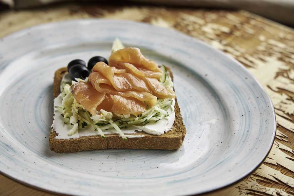 Подсушенный ломтик хлеба намажь сыром, сверху положи 2-3 тоненько нарезанные полоски лосося. Укрась бутерброд нарезанным соломкой огурцом.