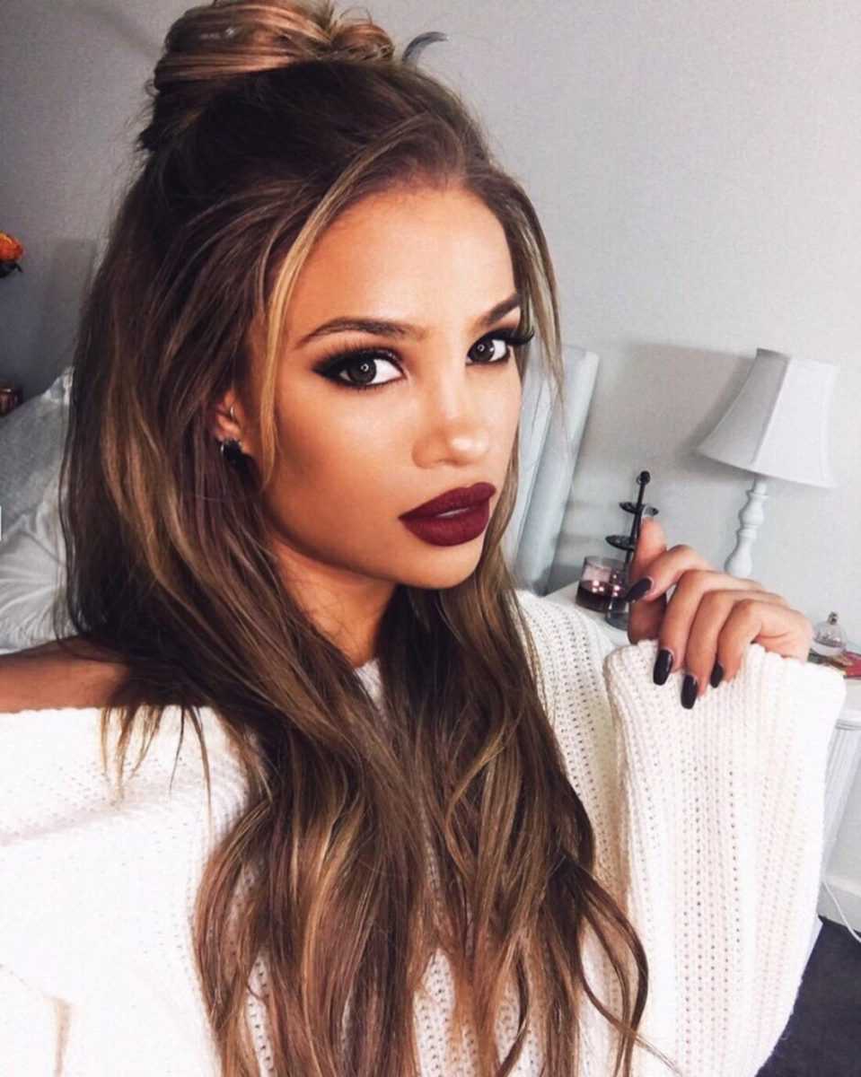 Если у вас темные волосы, рассмотрите коричневые, карамельные, шоколадные и коричные блики. Для более смелого эффекта попробуйте красочные полосы. Многое зависит от тона вашей кожи и цвета глаз