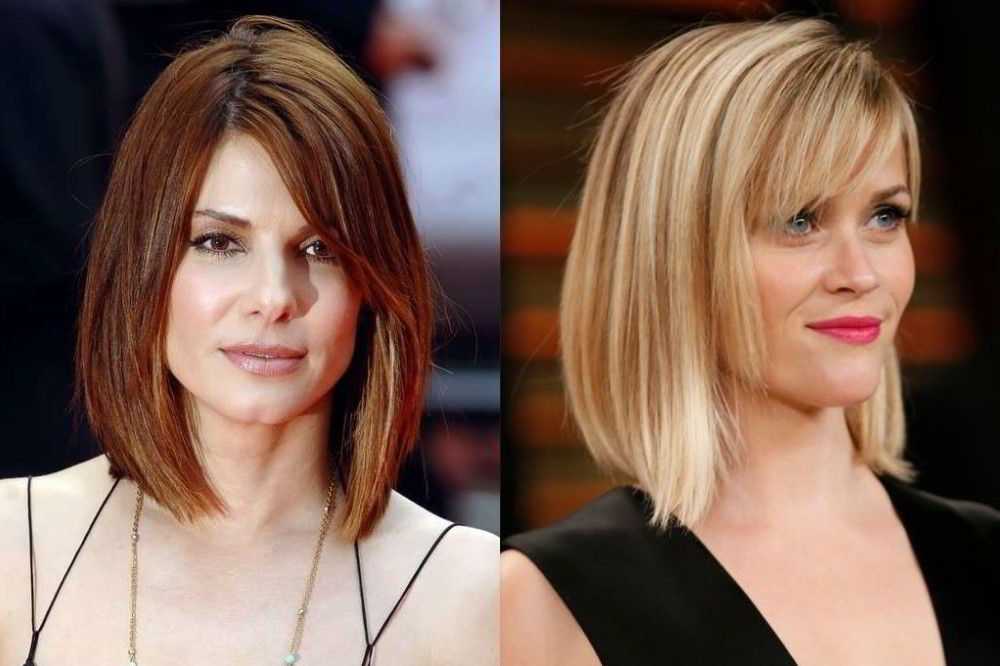 Выбирайте удлиненные варианты, ниже уровня плеч, с градуировкой на концах, с боковым пробором. Избегайте гладких причесок, которые заканчиваются до линии челюсти, пышных локонов.