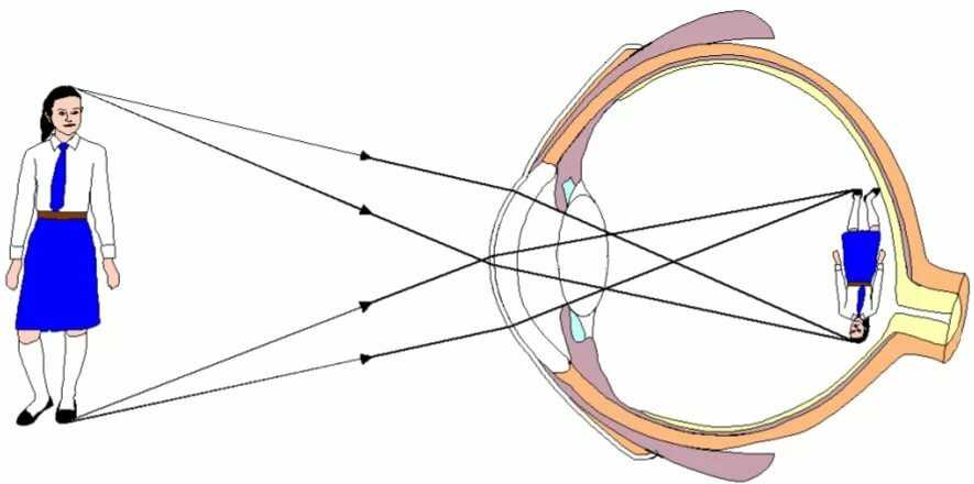 Изображение, возникающее на сетчатке глаза, появляется там перевернутым и уменьшенным. Затем оно корректируется и преобразуется в информацию мозгом, чтобы мы могли правильно его воспринимать.