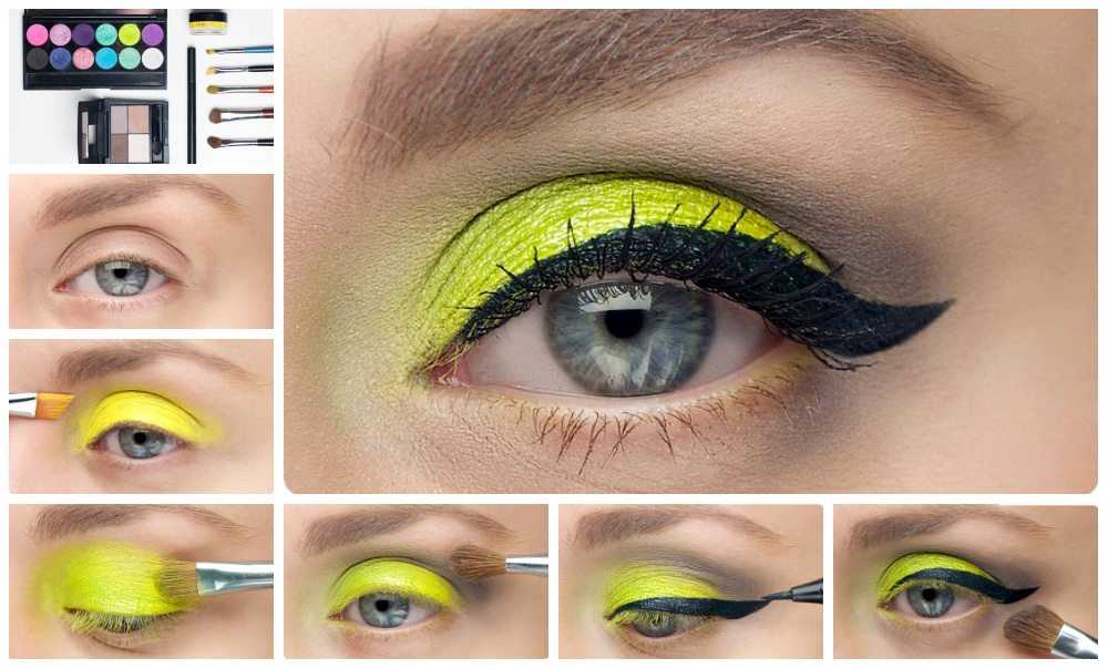 Следующий fashion makeup требует наличия такой декоративной косметики: база под тени, ярко-лимонная гелевая подводка, салатовые, бежевые, серые тени, черная подводка, кисти, тушь черного цвета. Для губ подойдет любой нюдовый оттенок помады.