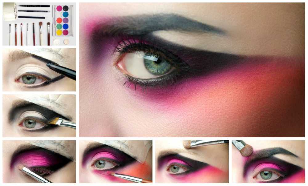 Чтобы исполнить этот яркий макияж в стиле fashion вам потребуется: база под тени, черный карандаш, яркие пурпурные, черные, серебристые, лавандовые, оранжевые, песочные тени, черная подводка, скотч, кисти, черная тушь. Для губ можно использовать помаду цвета фуксия.