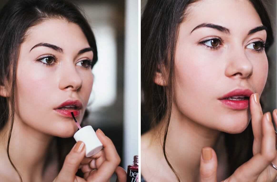 Выбирайте оттеночные блески для губ или тинты, желательно – с SPF-защитой. А любимую помаду, лучше – с высоким содержанием пигмента, наносите особым образом. Вбейте пигмент подушечками пальцев, промокните салфеткой и повторяйте такие действия до тех пор, пока не добьетесь желаемой насыщеннности.