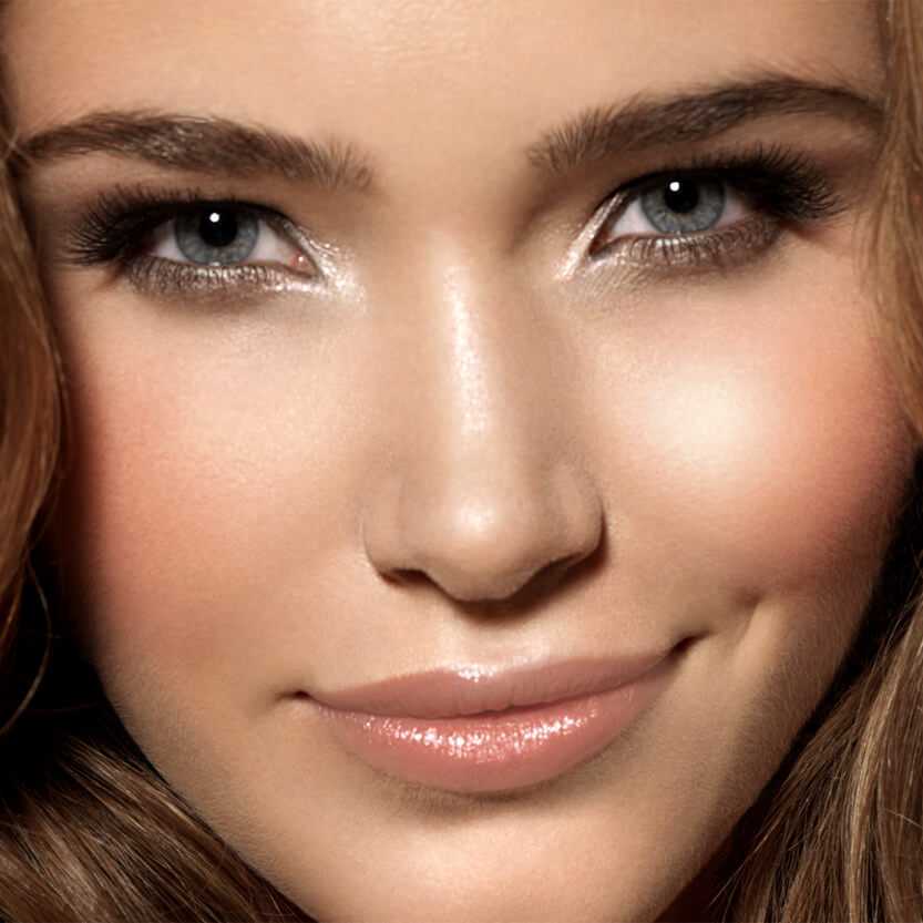 Выбирайте шиммерные текстуры и оттенки с персиковым или розовым подтоном, а бронзер наносите туда, куда падают лучи солнца: на спинку носа, височную зону и под скулы. Румяна или бронзер, нанесенные таким образом, создают эффект здорового, «детского» румянца. Если у вас нет бронзера с шиммерной текстурой, используйте матовый: под воздействием температуры он приобретет нужный вид.