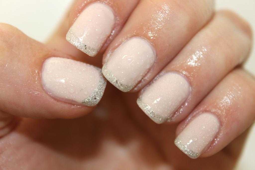 Однако здесь есть один большой нюанс: блестки для дизайна стоит брать мелкие, в противном случае получатся не четкие границы рисунка, а сам он очень объемным, из-за чего будет сложно выполнить выравнивание ногтевой пластины. Сравните два варианта френча с крупными и мелкими блестками и как четко видна граница в одном случае, а какая они расплывчатая во втором.
