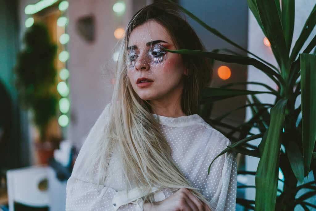 - Блесток не должно быть много (если это не какой-то тематический образ, когда можно хоть на всё тело). В макияже стоит сделать акцент на чем-то одном — либо на глазах, либо на губах, либо же на щеках в качестве хайлайтера.