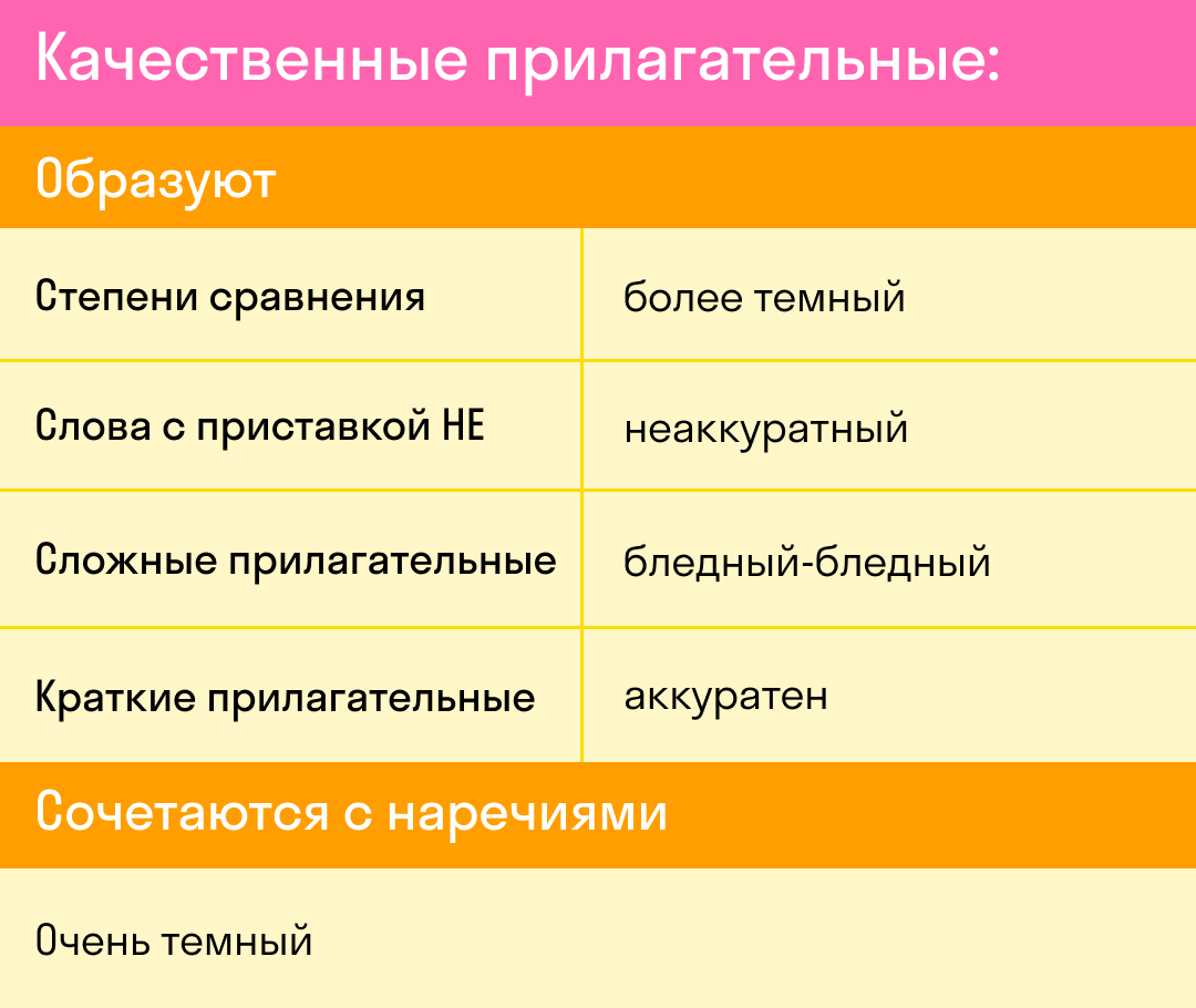 Как мы видим в таблице, каждый разряд прилагательных имеет свои признаки, и в данную группу входят слова, которые описывают качества предмета или явления. Под качествами подразумеваются: