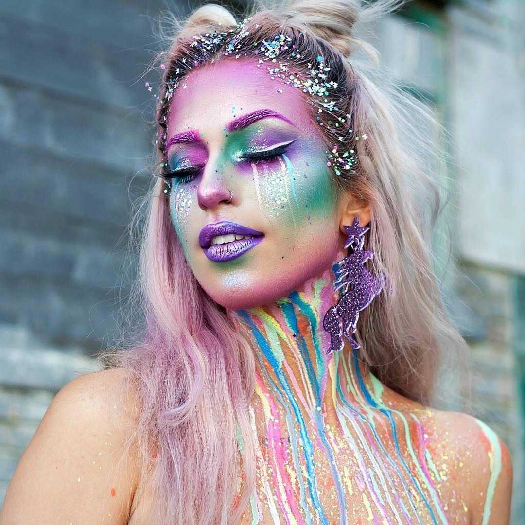 - Также в этом образе хорошо будут смотреться накладные ресницы или тушь ярких радужных цветов.