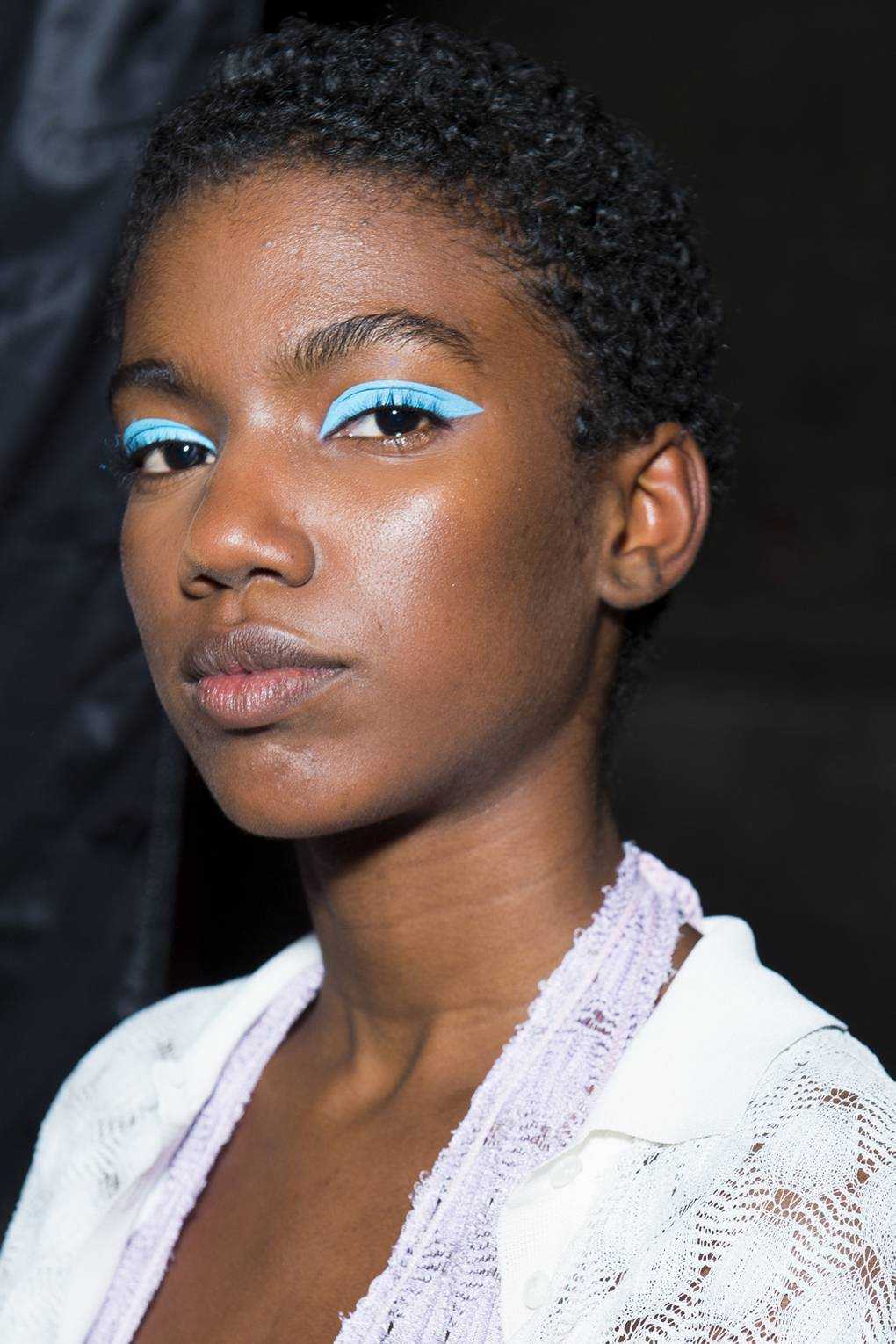 Еще одним модным цветом для весны 2019 являются голубые тени. Такие тени олицетворяют небесно голубое небо и помогают освежить лицо. Голубой цвет очень гармонично сочетается с черными стрелками, а также с нестандартным цветом брасматика, синим или зеленым.