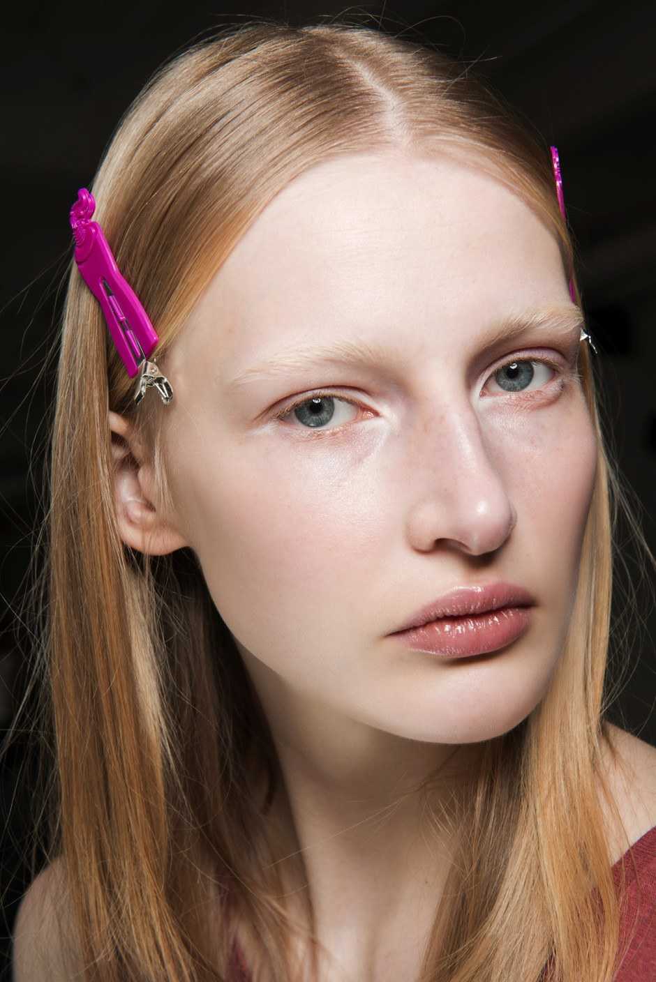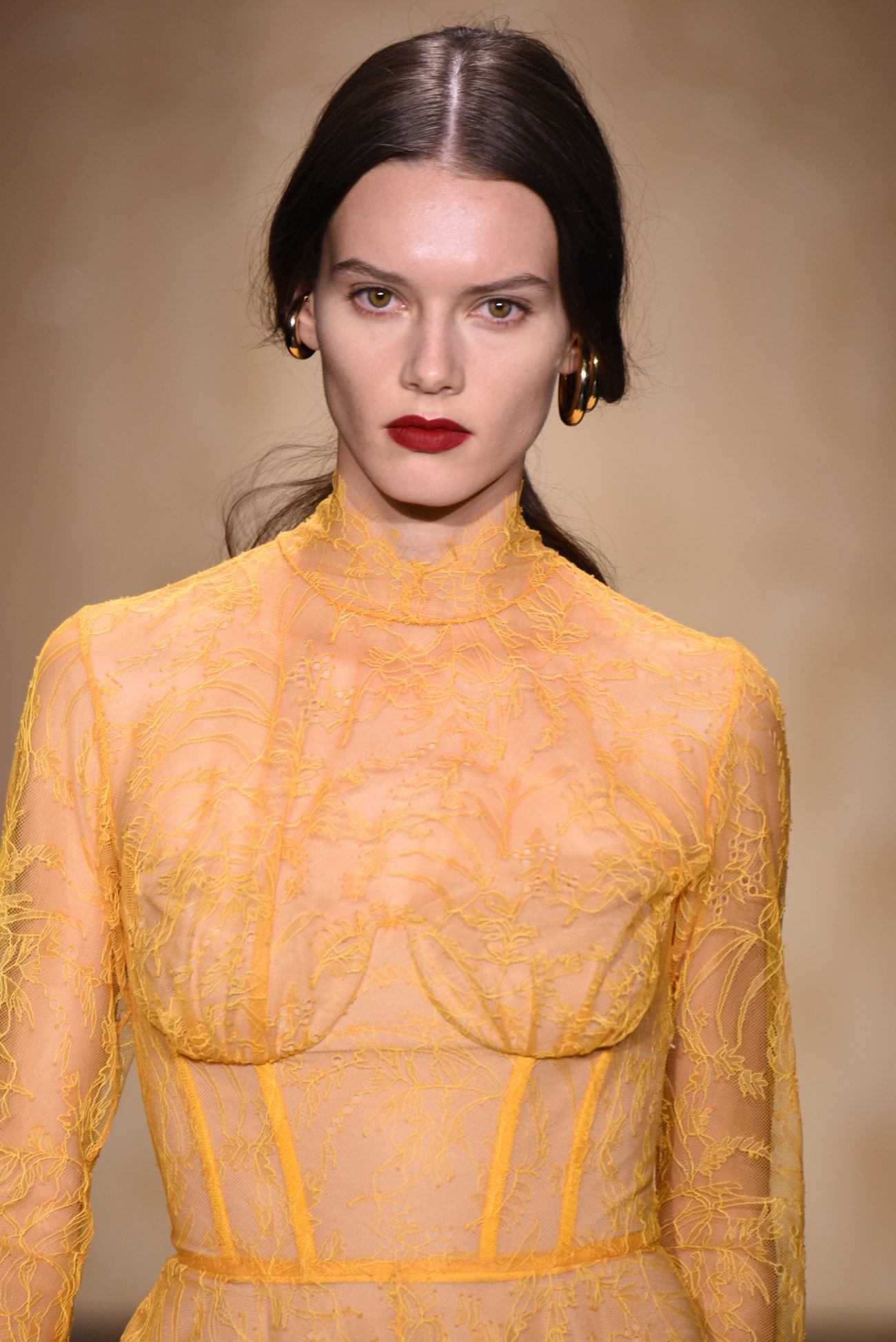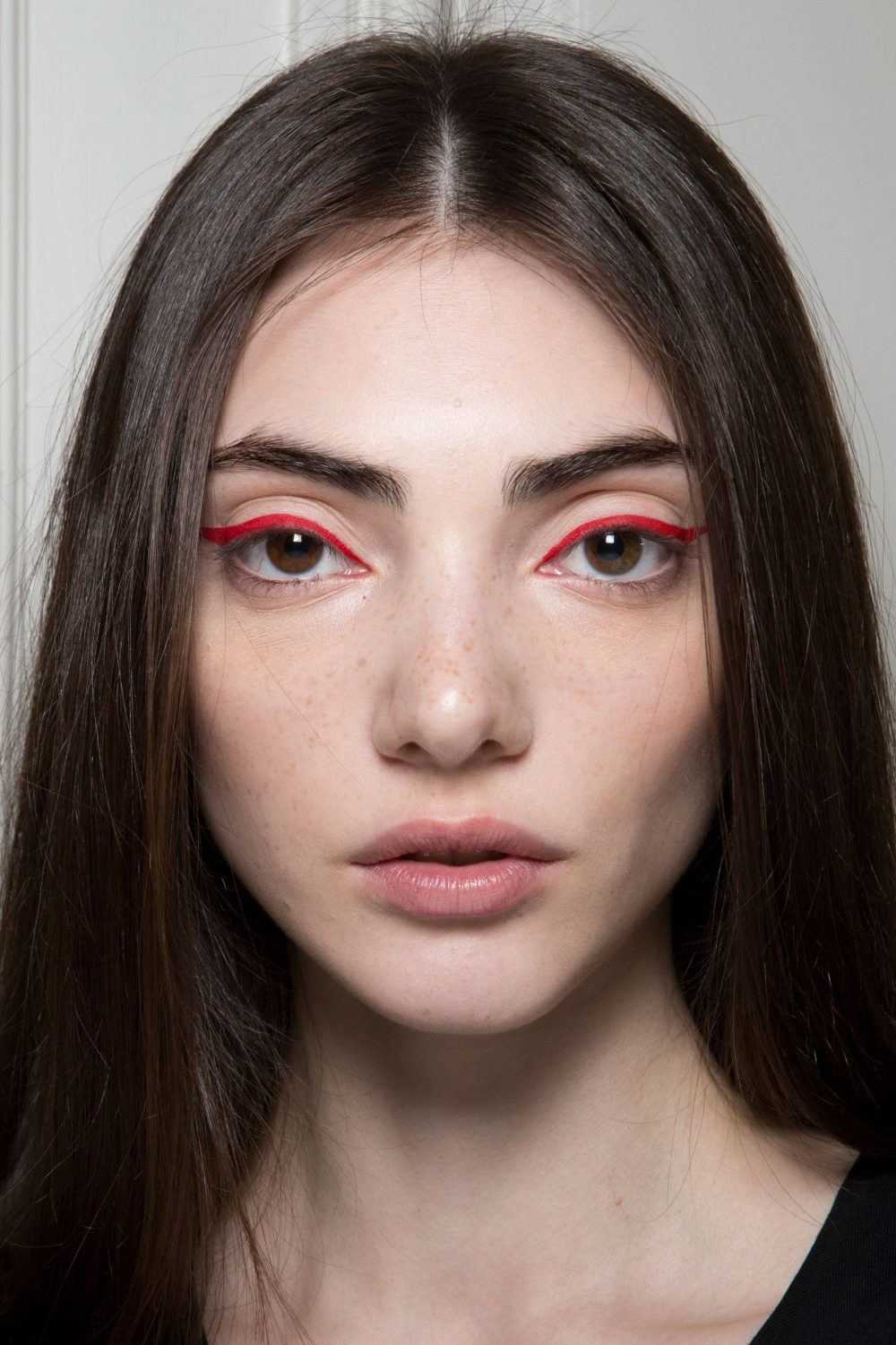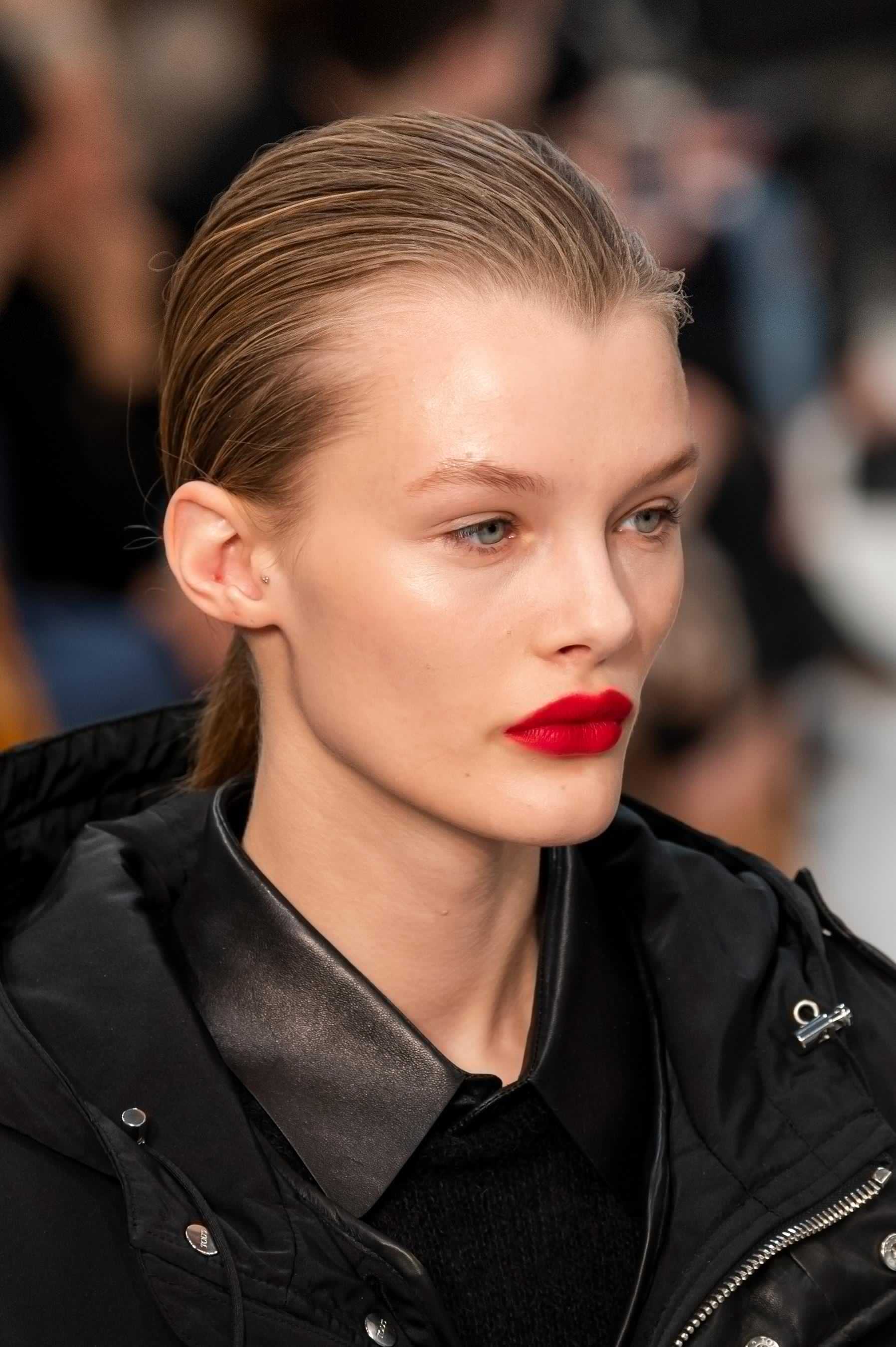 Вечная классика. В некоторых коллекциях наблюдаем моделей с минимумом макияжа и яркой красной помадой. Выглядело необычно, но свежо. Если вы еще не в секте среди поклонников красной помады, то самое время начать подбирать свой идеальный оттенок.