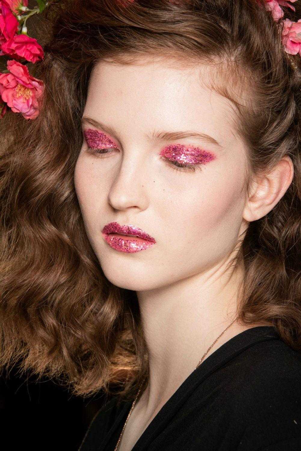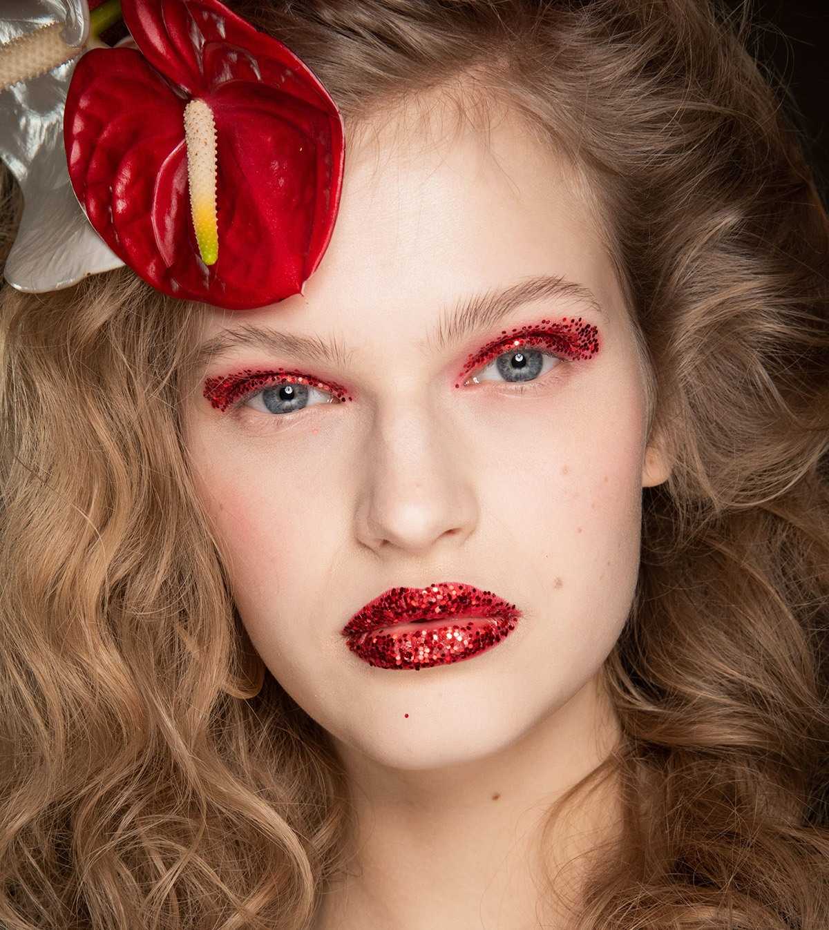 Мерцающие акценты предлагается наносить не только на веки, но и на любые другие участки лица. Ресницы вполне могут быть цветными, к примеру, розовыми. В классическом цветовом решении они должны быть утрированными: склеенными, торчащими в разные стороны или намеренно подчеркнутыми у нижнего края глаза. Губы манят яркими оттенками черники, малины, вина, спелой сливы, завораживают глянцевым блеском, нанесенным «как попало», или, напротив, привлекают четкой прорисовкой контура.