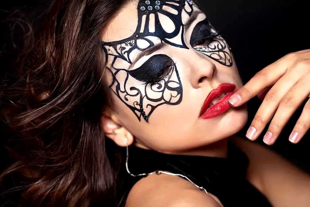Еще важно создать особый грим с симметричными деталями. Макияж можно сделать как на всем лице, так и на одной стороне