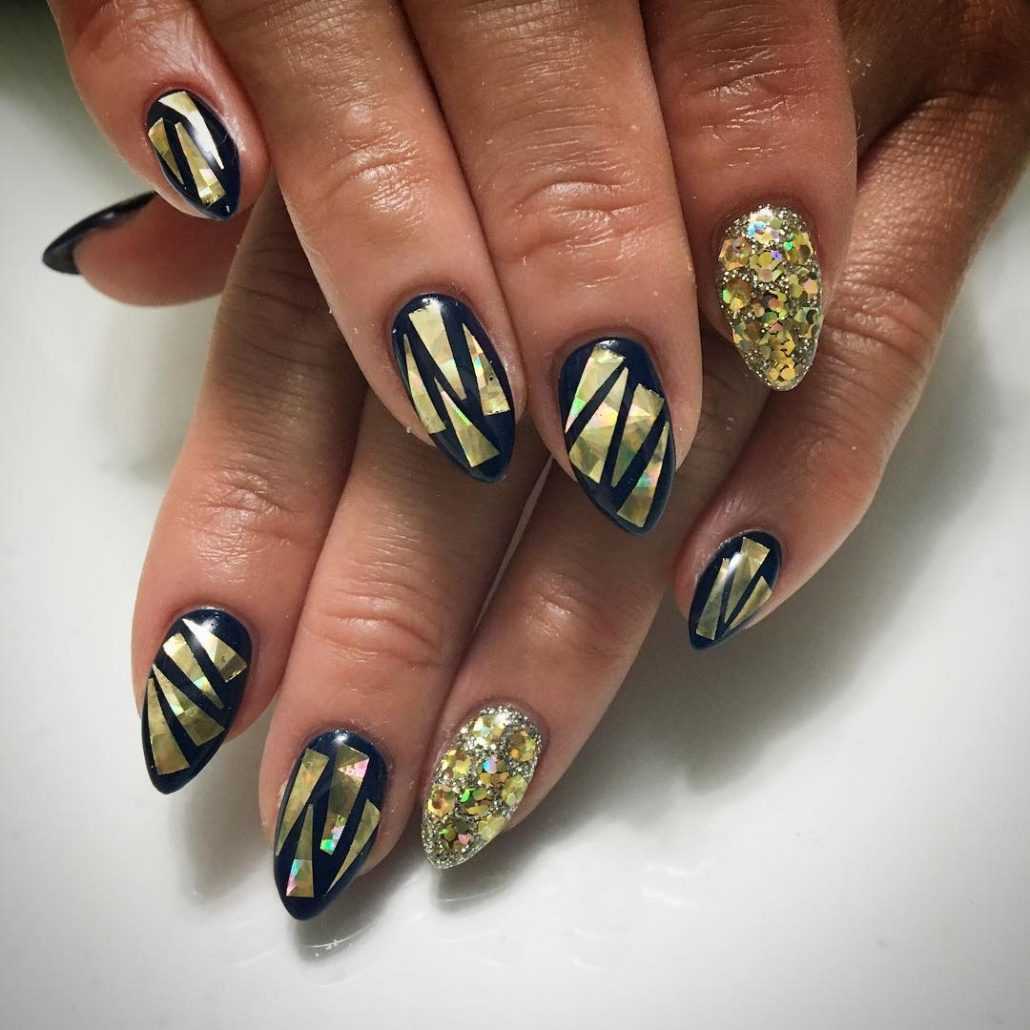 Эффектно выглядит модный маникюр при использовании черного фона с серебристыми или золотистыми осколками. Такой дизайн ногтей создает трехмерный узор, который завораживает и притягивает взгляды. Им можно любоваться целую вечность. Сейчас также востребован геометрический маникюр с битым стеклом.
