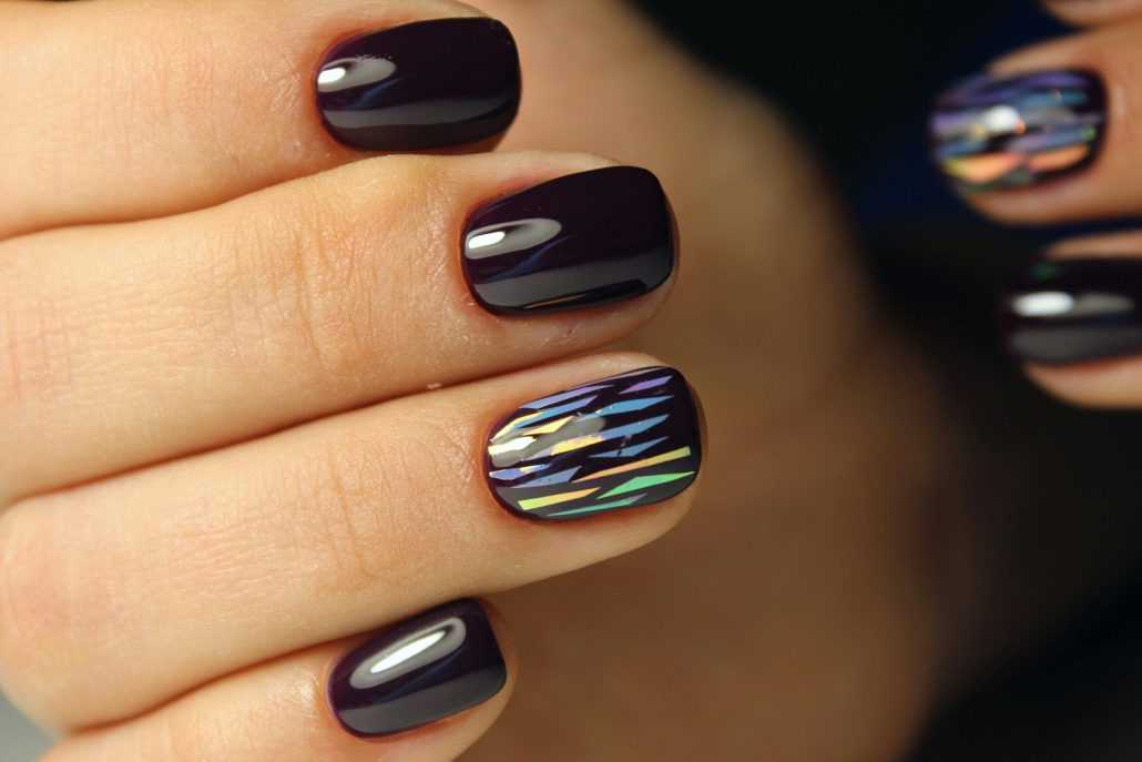 Маникюр, выполненный в данной технике, представляет собой кусочки голографической фольги, нанесенные на ногтевую пластину в произвольном порядке или в виде определенного рисунка. Цветовая гамма такого материала достаточно широка, поэтому у вас есть возможность воплотить в жизнь свои наиболее смелые и фантастические идеи.