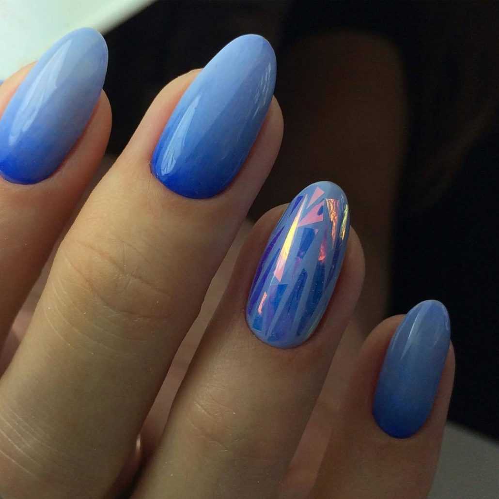 Для того чтобы маникюр выглядел лаконичным, но при этом имел свою неповторимую изюминку, можно оформить в стиле «битое стекло» только несколько ногтей, а остальные покрыть однотонным гель-лаком. Конечно же, сложно не упомянуть о романтичном и нежном варианте, в котором используются лаки пастельных тонов или вообще бесцветное покрытие, поверх которого в хаотичном порядке укладываются фольгированные кусочки.