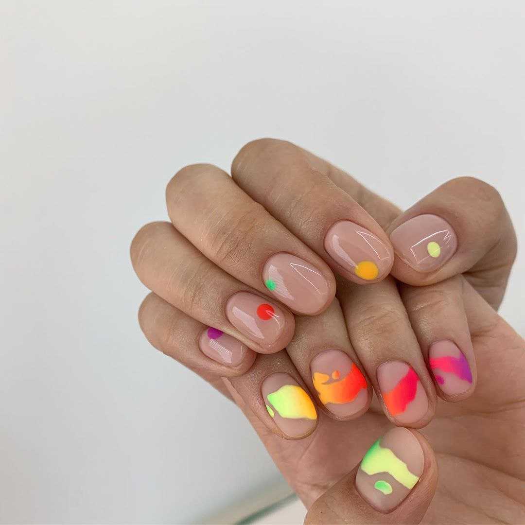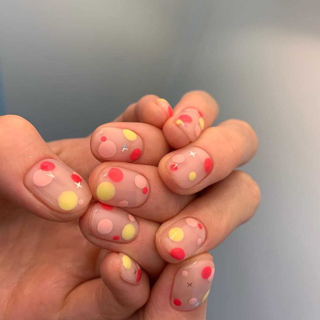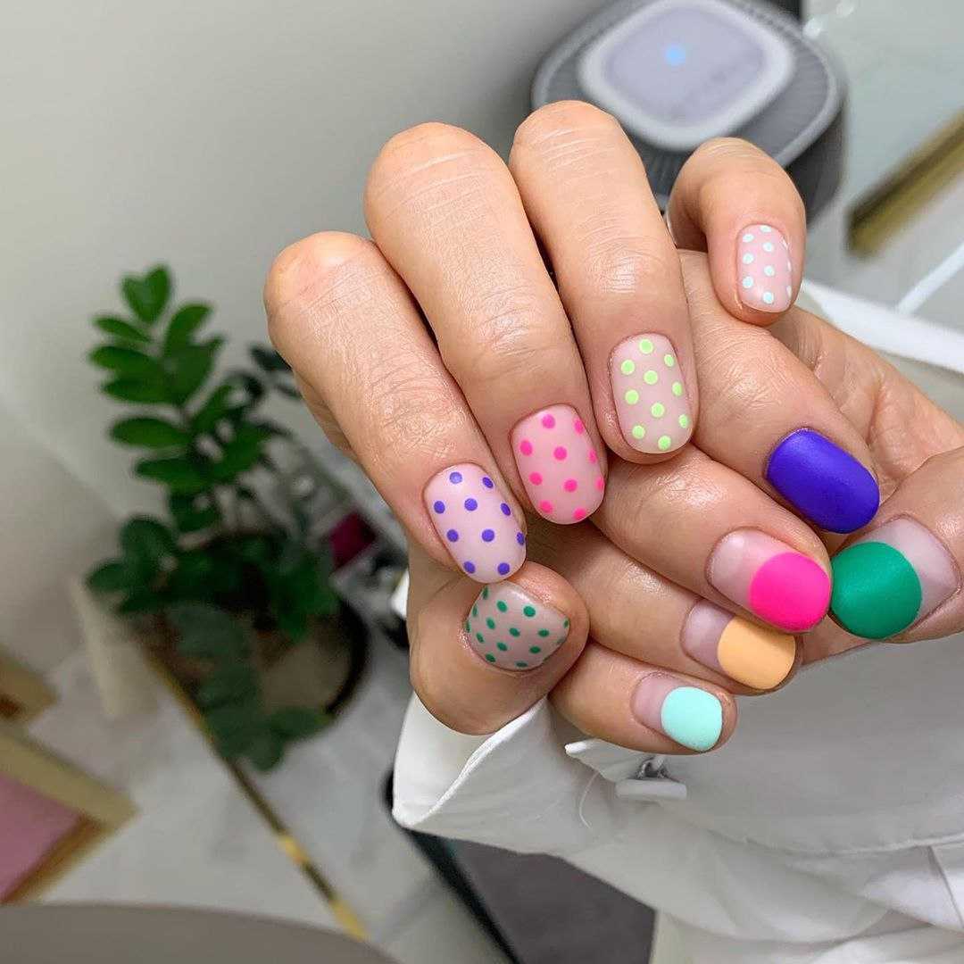 Простой, но в то же время оригинальный маникюр с точками — один из самых популярных в летнем сезоне. Точки могут быть разного размера, ведь это вовсе никак не влияет на эффектность оформления. Также в некоторых случаях можно сделать точки разноцветными. Столь яркий, необычный дизайн — то, что нужно в летнем сезоне.
