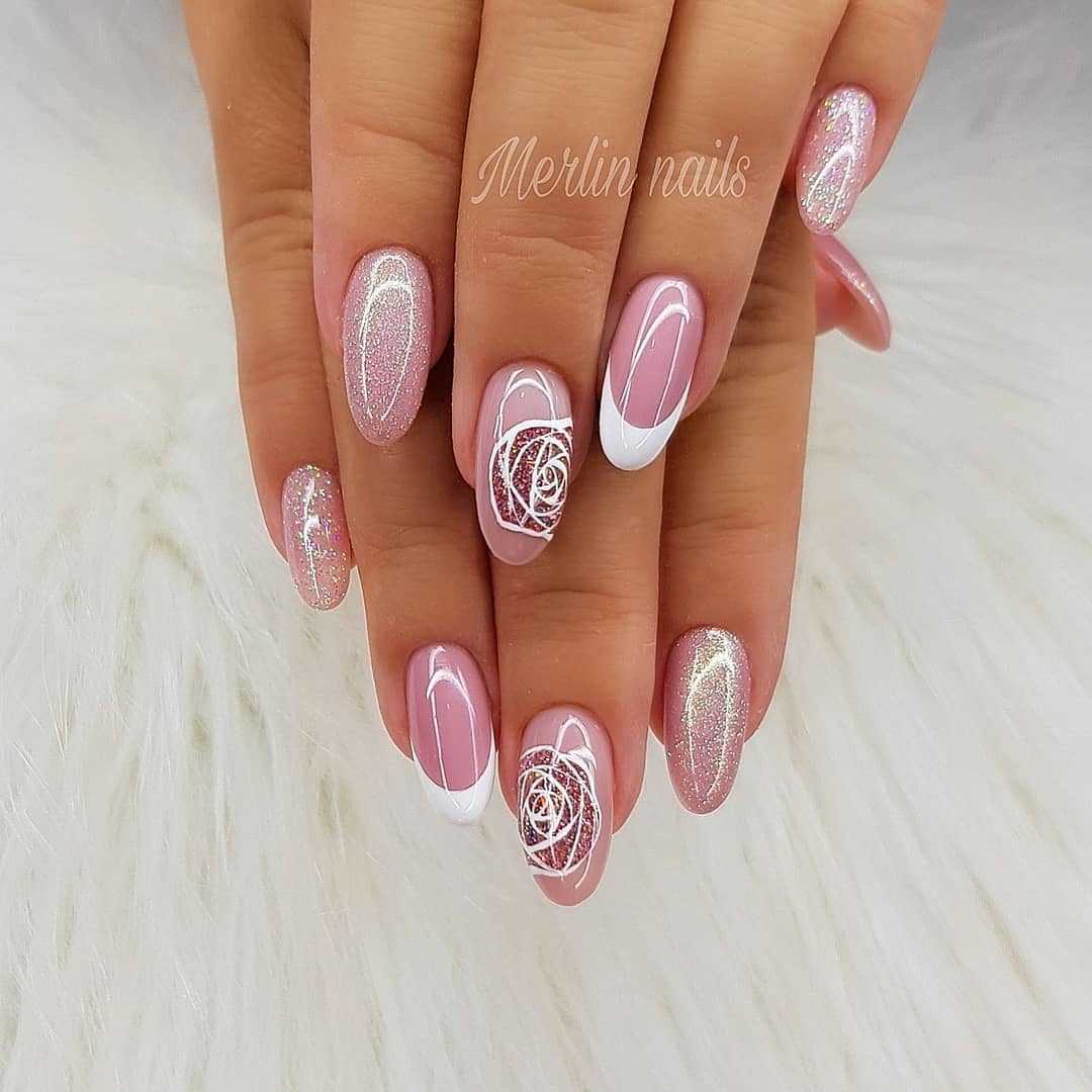 Стильной задумкой в 2020 сезоне также является выделение блестящим лаком или рассыпчатым глиттером области улыбки во френче.