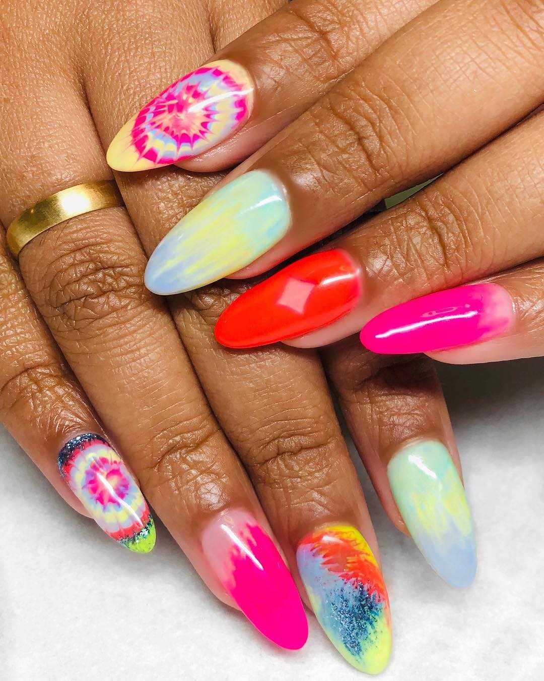 Абстрактные узоры этим летом пользуются большой популярностью, ведь такое многообразие оригинальных идей просто не может остаться незамеченным. Ноготки миндалевидной формы очень красиво смотрятся с хаотичными полосками, необычным исполнением растяжки цвета, мазками, потёками, расплывчатыми узорами, напоминающими по виду дымку, яркими штрихами или вкраплениями. Подобные узоры и рисунки могут украшать ноготки как самостоятельный дизайн или являться составляющей частью более масштабной композиции. Абстракция красиво сочетается с блёстками, другими рисунками и эффектно выделяет акцентные ноготки.