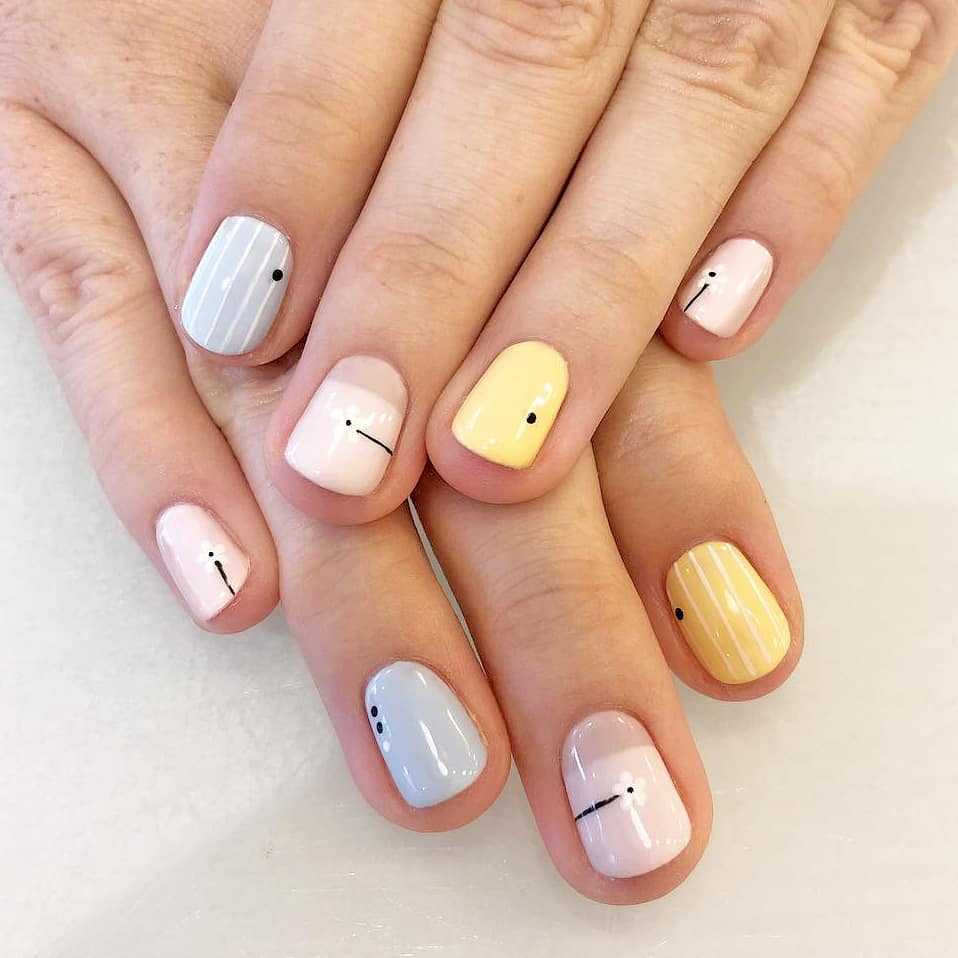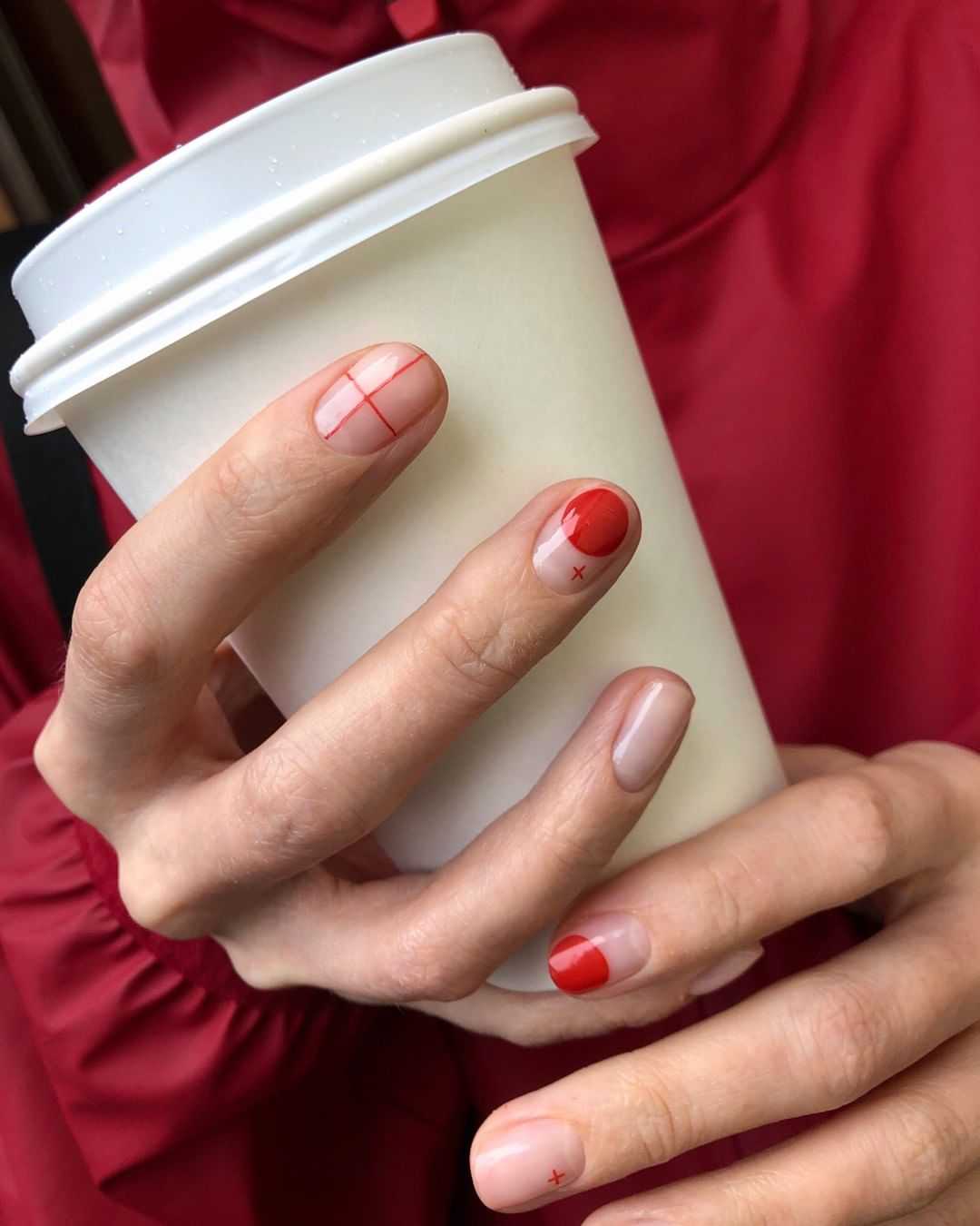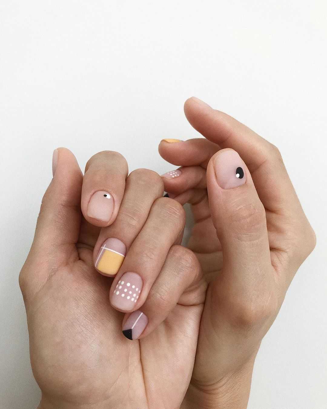 Вновь мастера предлагают вспомнить геометрический дизайн. Различной толщины точки и линии, фигуры и многое другое в летнем сезоне 2020 буквально на пике популярности. Тем более, что его всегда можно разнообразить скотч-лентой и другим декором по собственному вкусу. В качестве основного покрытия маникюра и педикюра прекрасно смотрятся не только пастельные, но и яркие цвета.